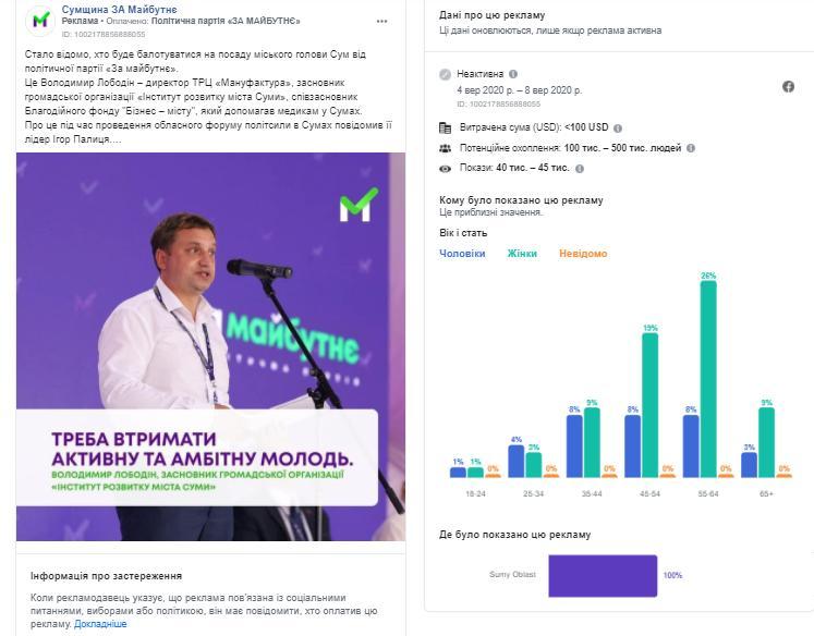 Громадянська мережа ОПОРА проаналізувала політичну рекламу, яку протягом вересня 2020 року політичні партії та місцеві політики поширювали в Facebook на аудиторію міста Суми та області. Згідно з даними Бібліотеки політичної реклами Facebook, найбільшу кількість дописів рекламували сторінки партій «За майбутнє» та «Наш Край».