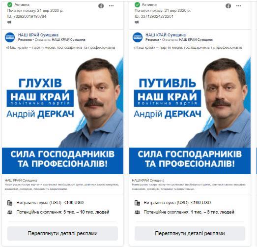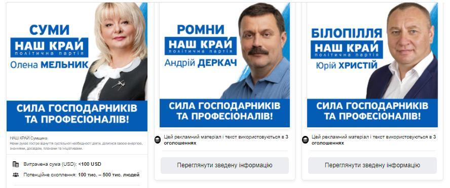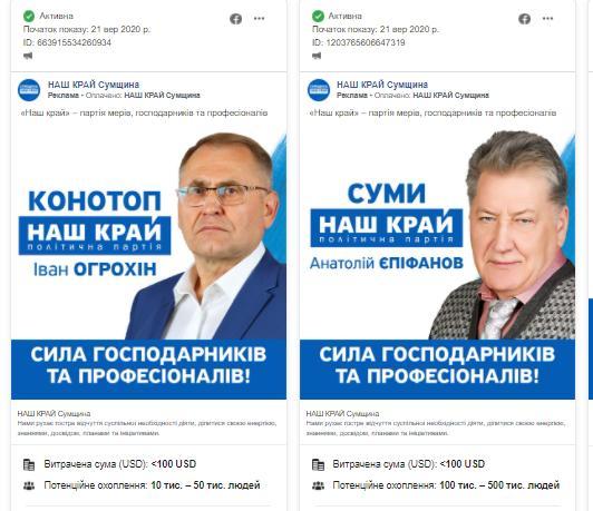 Сторінка «Наш Край Сумщина» та «Наш Край» рекламувала свої дописи за регіоном «Сумська область» близько 140 разів. Дописи містять лозунг партії «Сила господарників та професіоналів» та імена кандидатів від партії на місцеві вибори 2020: Андрій Деркач, Олена Мельник, Микола Нога, Юрій Христий, Іван Огрохін, Микола Смілик, Петро Кідіменко, Микола Мірошніченко, Анатолій Єпіфанов. Крім того, рекламувати ролики з заходів, що проводив «Наш Край» на Дні міст у Кролевці, Глухові, Ямполі, Шостці, Конотопі, Сумах, Тростянці, Охтирці та Ромнах. На кожен з дописів витрачено до 100 американських доларів.