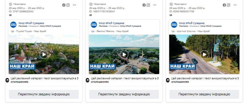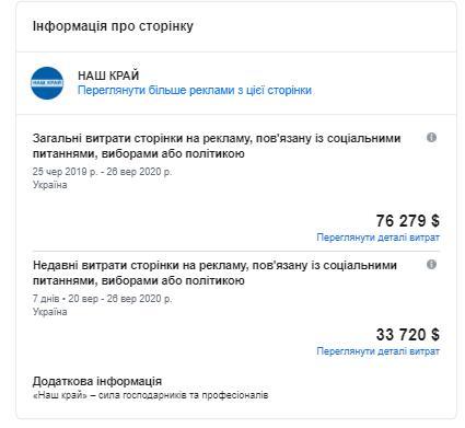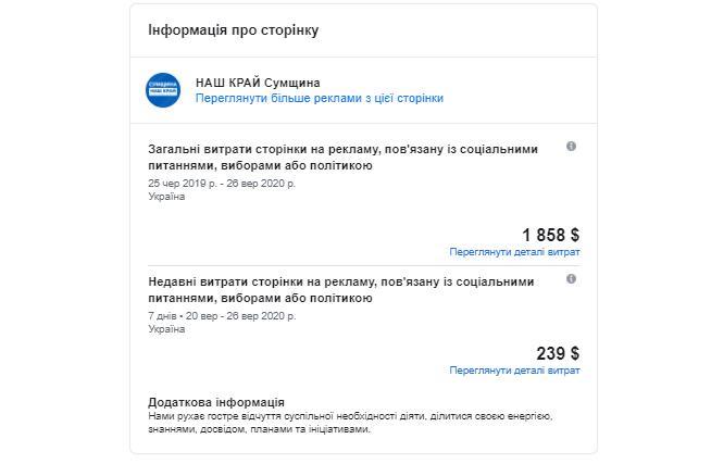 Загалом, за даними Бібліотеки політичної реклами Facebook витрати сторінки «Наш Край Сумщина» на рекламу, пов'язану із соціальними питаннями, виборами або політикою за період з 20 по 26 вересні складають 239 американських доларів. А загальні витрати сторінки «Наш край» за сім днів по всій Україні становлять в період 20 - 26 вересня 33 720 американських доларів.