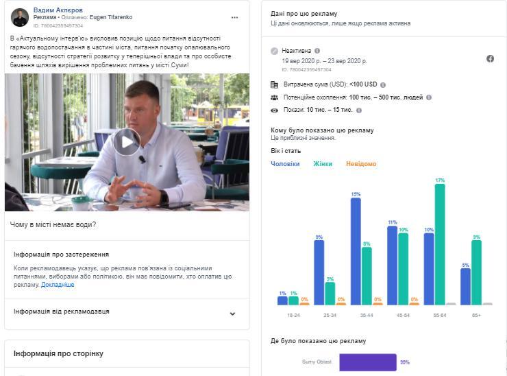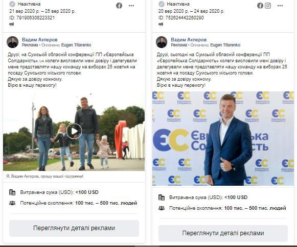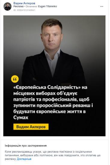 Голова Сумської територіальної організації політичної партії «Європейська Солідарність» Вадим Акпєров та кандидат на міського голову від політичної партії «Європейська Солідарність» рекламував у вересні чотири дописи, на кожен з яких витратили близько 100 американських доларів. В двох дописах йдеться: «Сьогодні на Сумській обласній конференції ПП «Європейська Солідарність» колеги висловили мені довіру і делегували мене представляти нашу команду на виборах 25 жовтня на посаду Сумського міського голови».