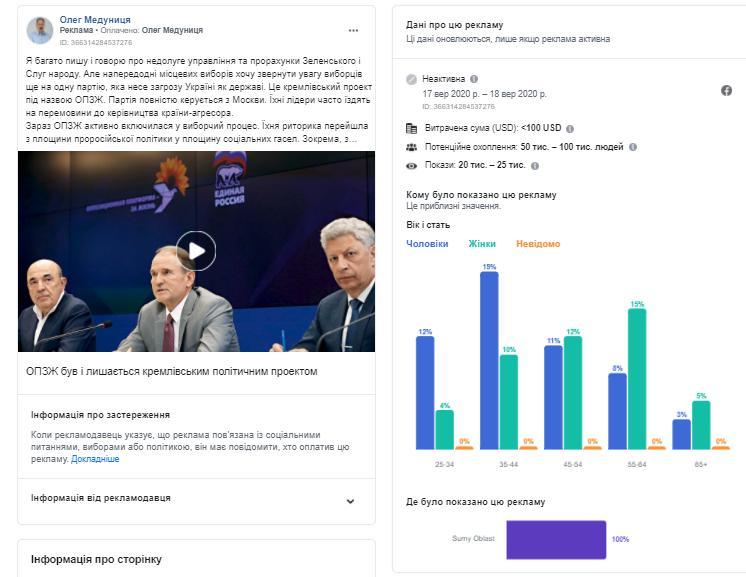 Офіційна сторінка політика, Олега Медуниці та кандидата в депутати від «Європейської Солідарності» до Сумської обласної ради вклала до 300 доларів на три пости. В одному з них йдеться про: «недолуге управління та прорахунки Зеленського і Слуг народу».