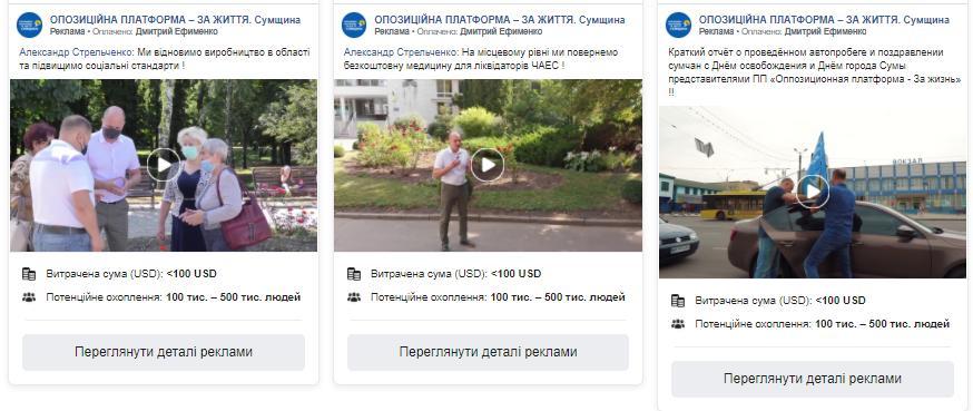 Два дописи висвітлюють діяльність депутата Сумської обласної ради Олександра Стрельченка. Також рекламуваkи «автопробіг на честь Дня визволення міста Суми від німецько-фашистських загарбників», а пост про те, що газ з осені подорожчає на 45% рекламували двічі. На кожен допис витрачено до 100 американських доларів.
