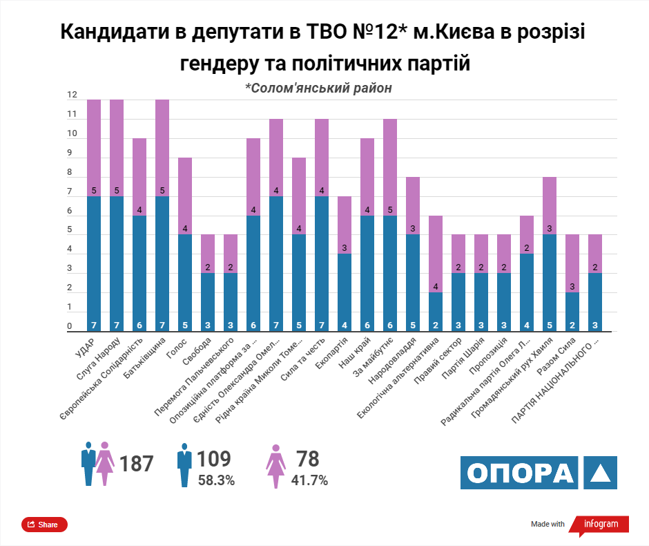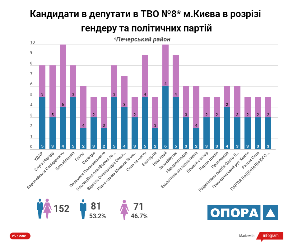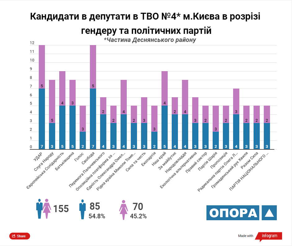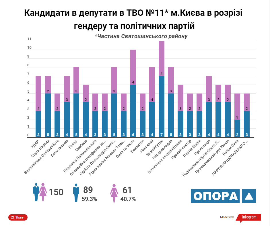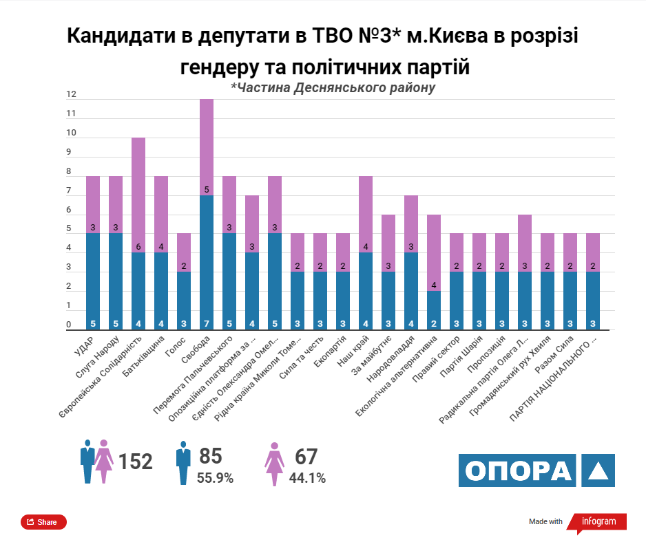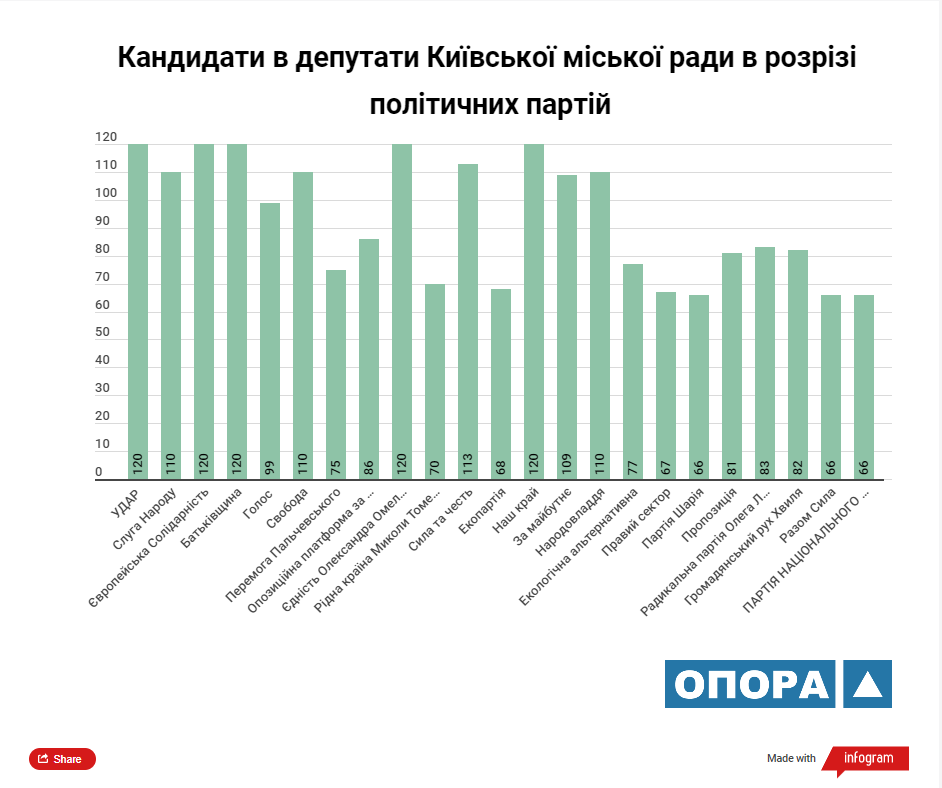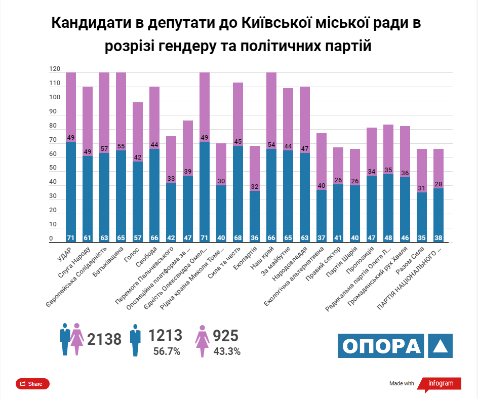 Згідно з аналізом ОПОРИ максимальну кількість кандидатів у депутати Київської міської ради ТВК зареєструвала від 5 політичних сил: «УДАР», «Європейська солідарність», ВО «Батьківщина», «Єдність Олександра Омельченка» та «Наш край». У розрізі статі з-поміж кандидатів переважають чоловіки, їх у списках майже 57%.
