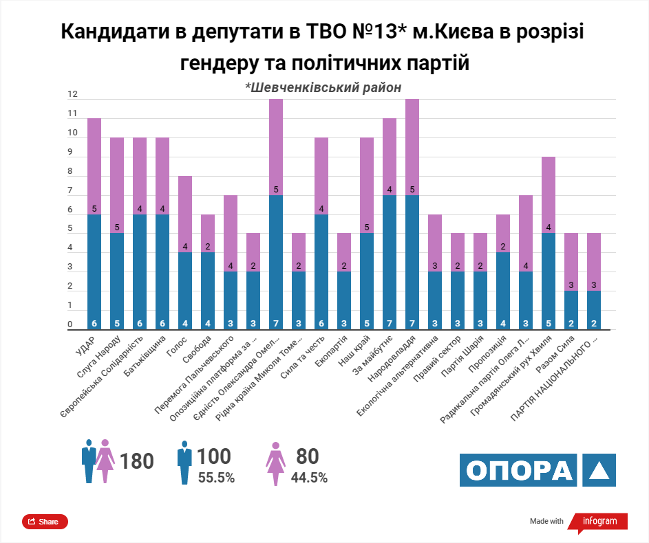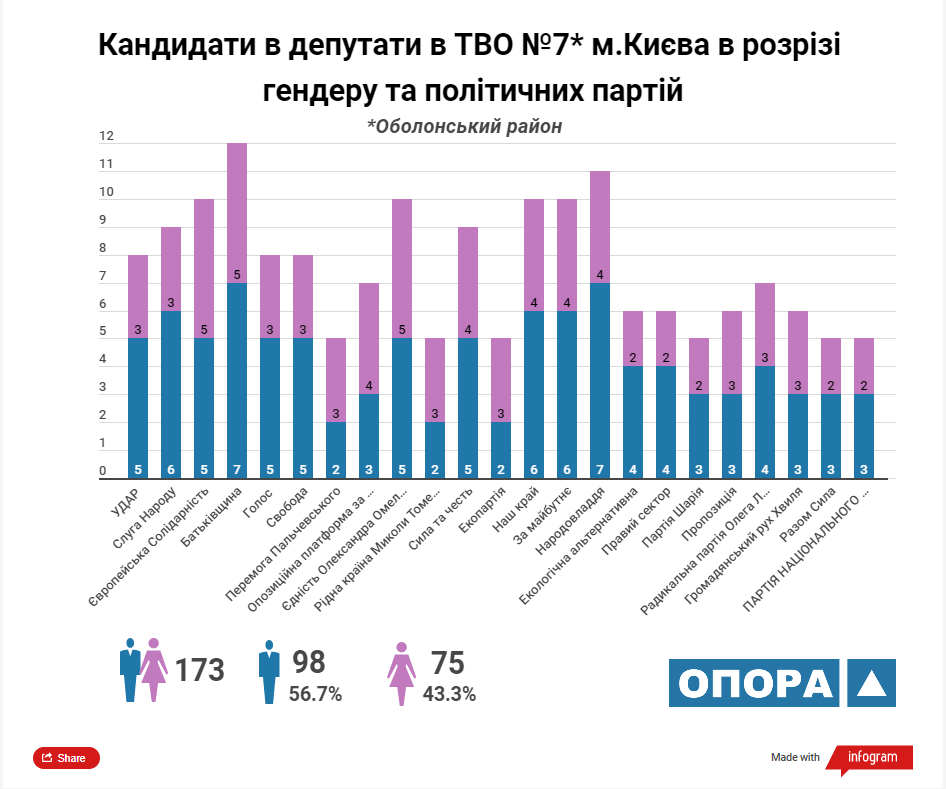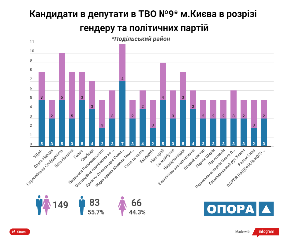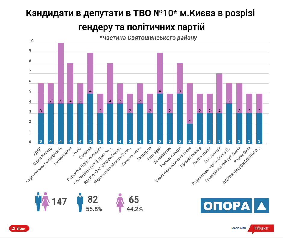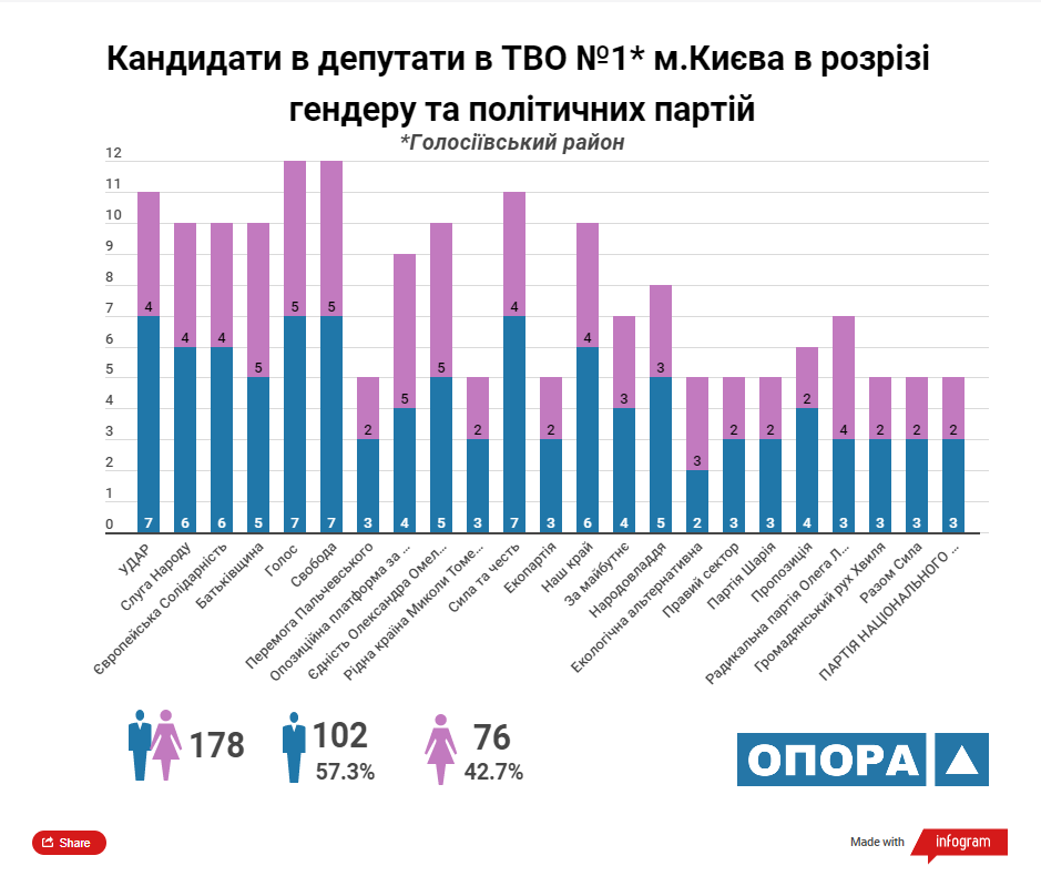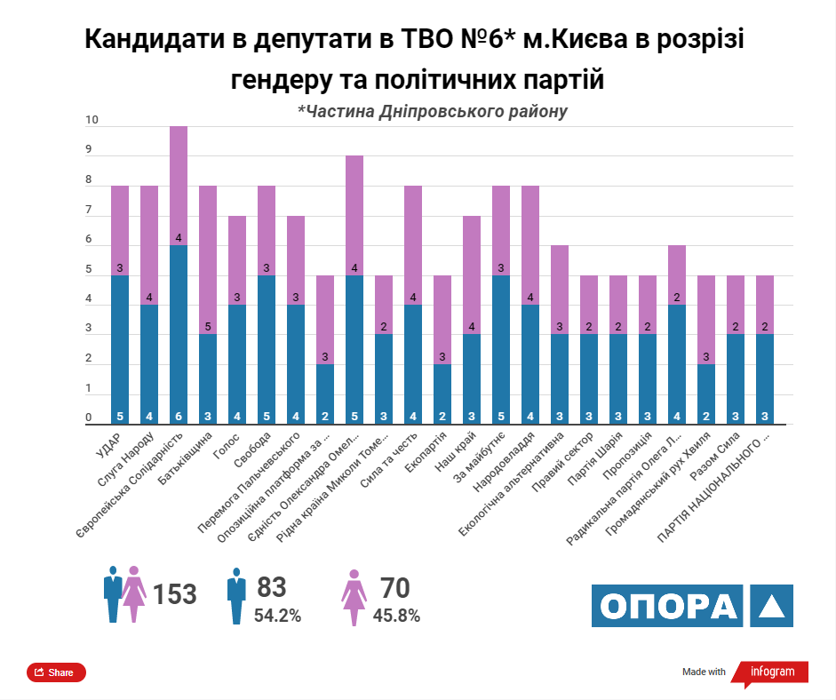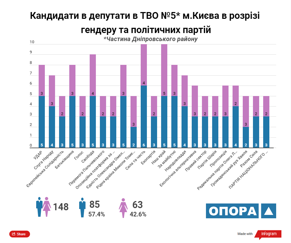 Згідно з аналізом ОПОРИ максимальну кількість кандидатів у депутати Київської міської ради ТВК зареєструвала від 5 політичних сил: «УДАР», «Європейська солідарність», ВО «Батьківщина», «Єдність Олександра Омельченка» та «Наш край». У розрізі статі з-поміж кандидатів переважають чоловіки, їх у списках майже 57%.