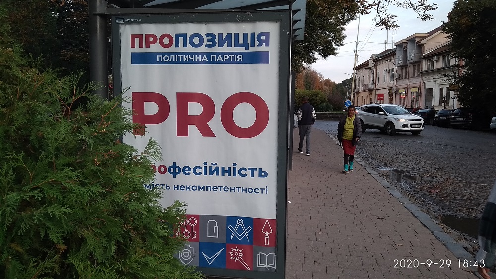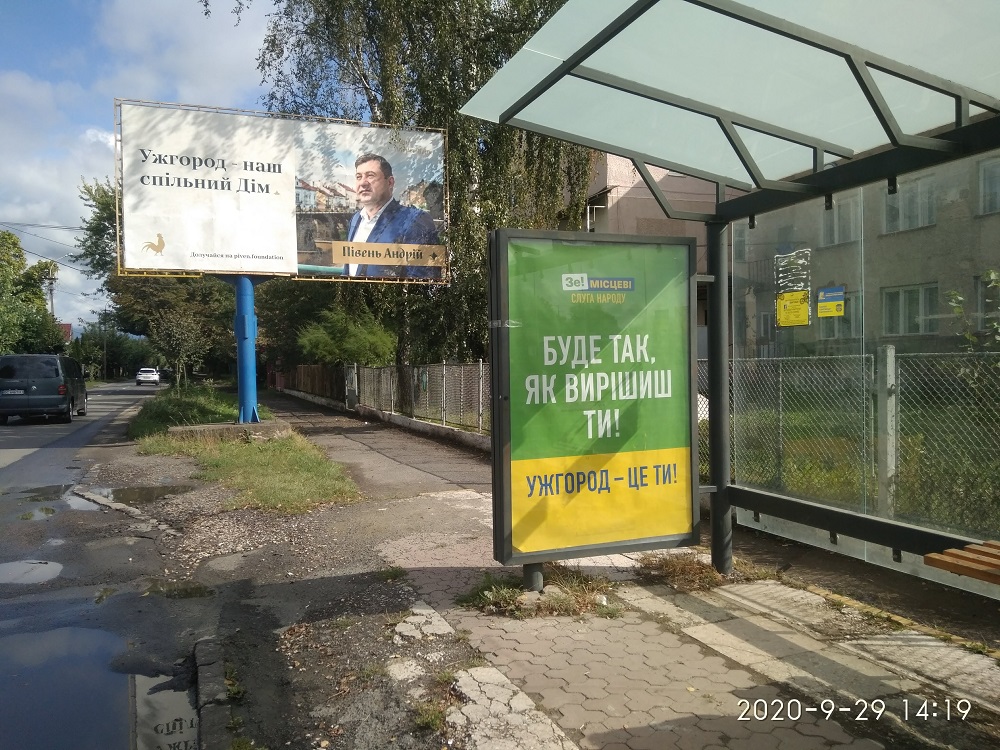 Станом на 29 вересня на зупинках в Ужгороді спостерігачі ОПОРИ зафіксували розміщені агітаційні матеріали попри те, що Виборчий кодекс забороняє розміщувати друковану агітацію на зупинках громадського транспорту.