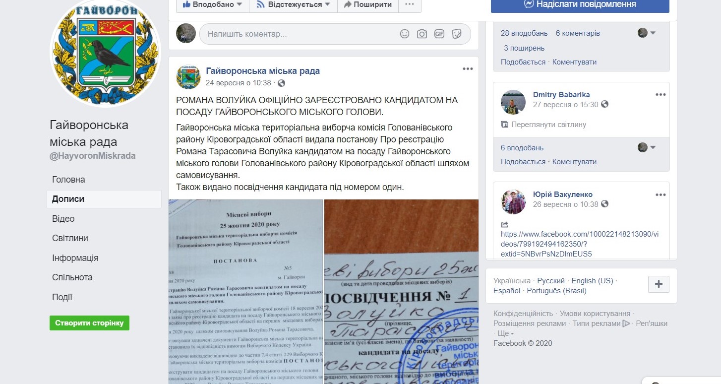 «Гайворонська міська територіальна виборча комісія Голованівського району Кіровоградської області видала постанову Про реєстрацію Романа Тарасовича Волуйка кандидатом на посаду Гайворонського міського голови Голованівського району Кіровоградської області шляхом самовисування. Також видано посвідчення кандидата під номером один», – йдеться в пості.