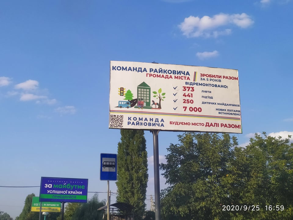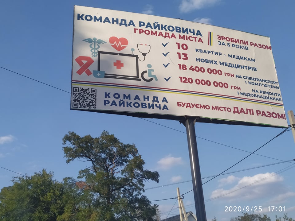 Сітілайти партії «Пропозиція» від якої балотується чинний міський голова Андрій Райкович з вихідними даними і фінансуванням з виборчого фонду містять слоган «Команда Андрія Райковича».
