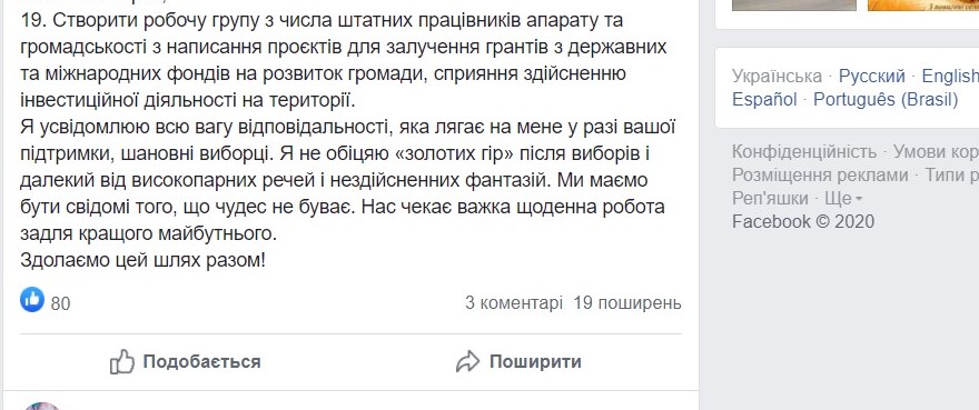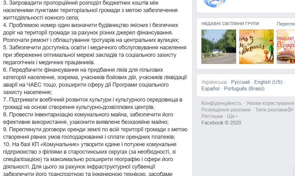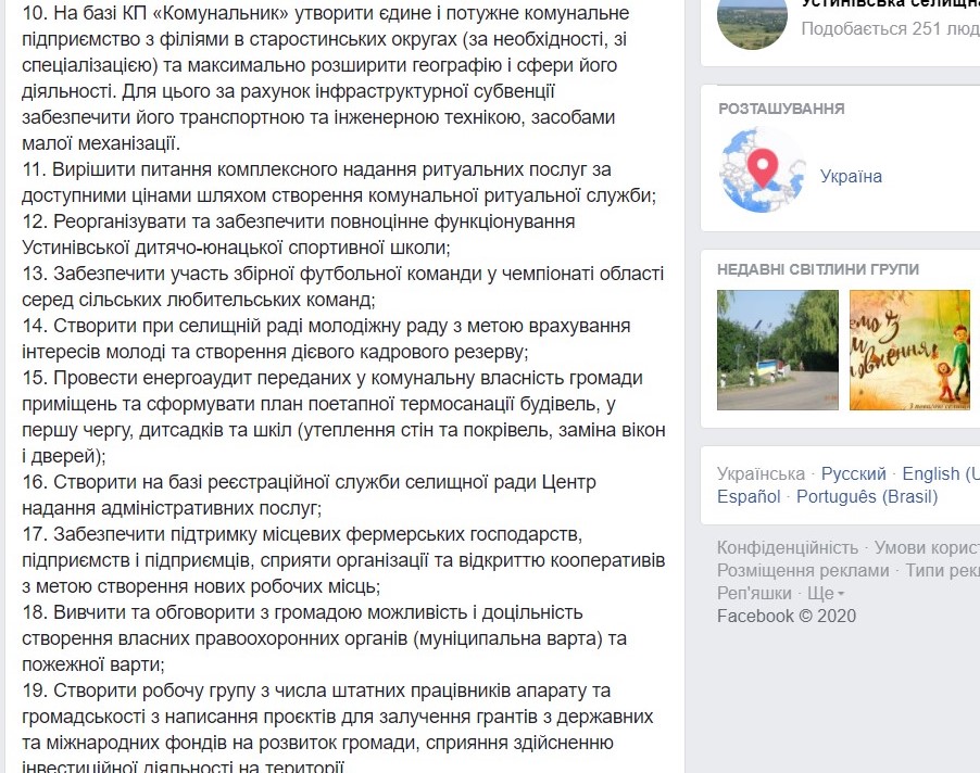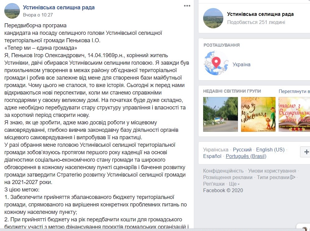 У групі Устинівської селищної ради у Facebook опублікували передвиборчу програму кандидата на посаду селищного голови Ігоря Пенькова. Він наразі чинний Устинівський селищний голова. У програмі передбачено 19 пунктів, серед яких: при прийнятті бюджету на рік передбачити кошти для громадського бюджету; вирішити питання комплексного надання ритуальних послуг за доступними цінами шляхом створення комунальної ритуальної служби; забезпечити участь збірної футбольної команди у чемпіонаті області серед сільських любительських команд тощо. Наприкінці посту додано заклик: «Здолаємо цей шлях разом». У цій групі публікують новини селища про встановлення майданчиків, привітання зі святом. Ще раніше у цій групі почали оприлюднювати інформацію з хештегом: «#щозробивПеньков».