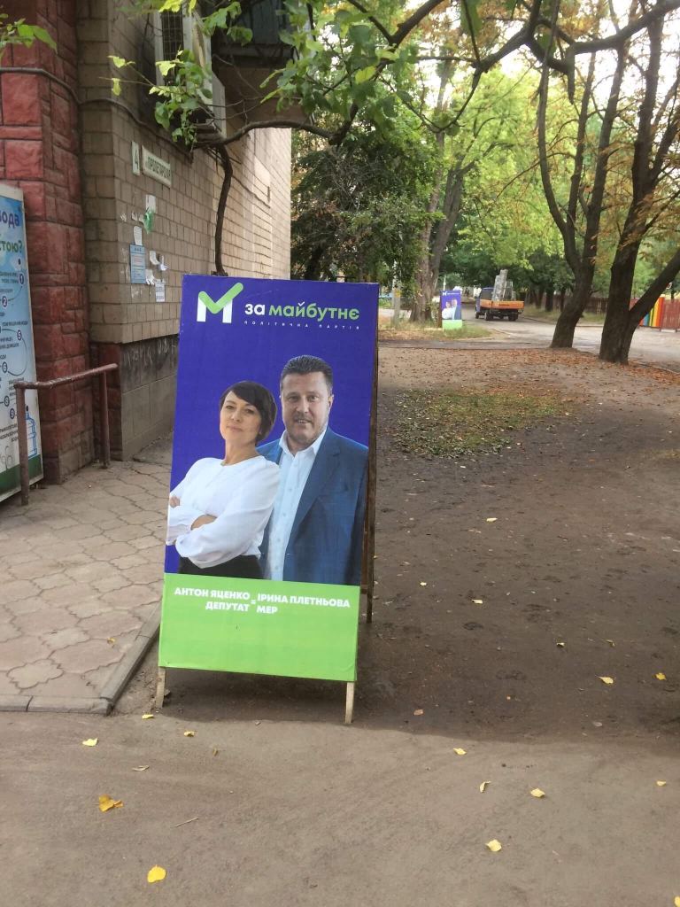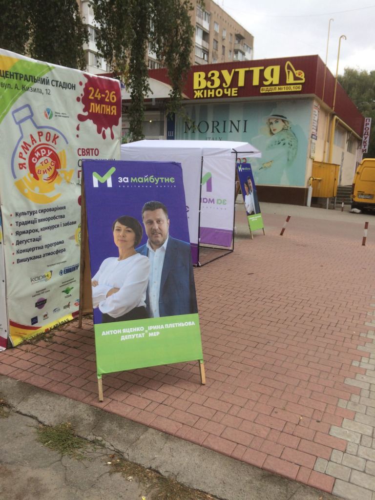 Того ж дня в м. Умань спостерігачі повідомили поліцію про рекламні конструкції партії “За майбутнє” із зображеннями кандидатки на посаду Уманської міської голови Ірини Плетньової та кандидата в депутати до Черкаської обласної ради Антона Яценка без вихідних даних розміщені на вул. Пролетарській 4, Тищика 13 А, вул Європейській та сквері Шевченка.