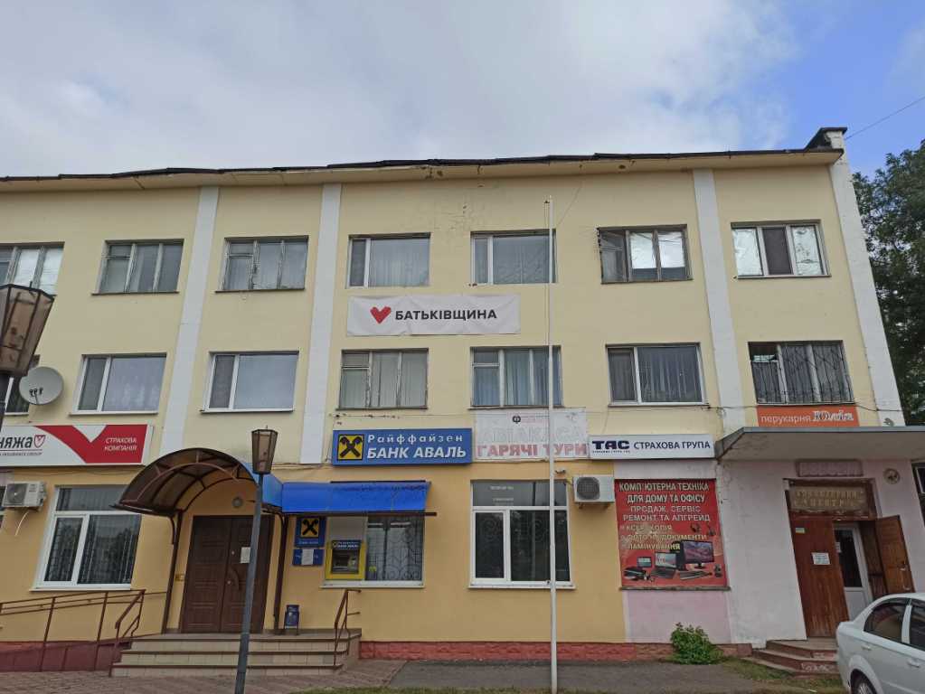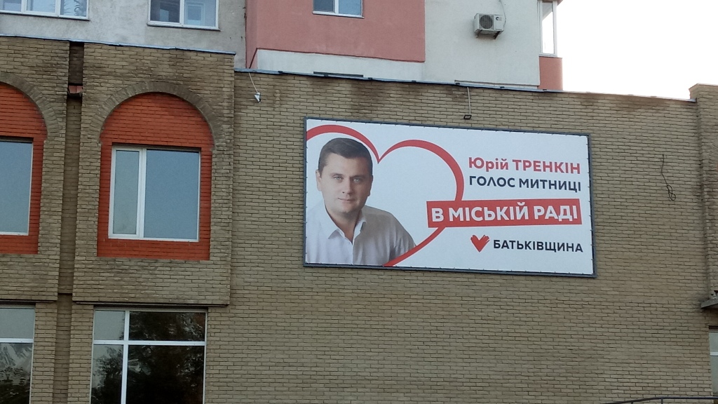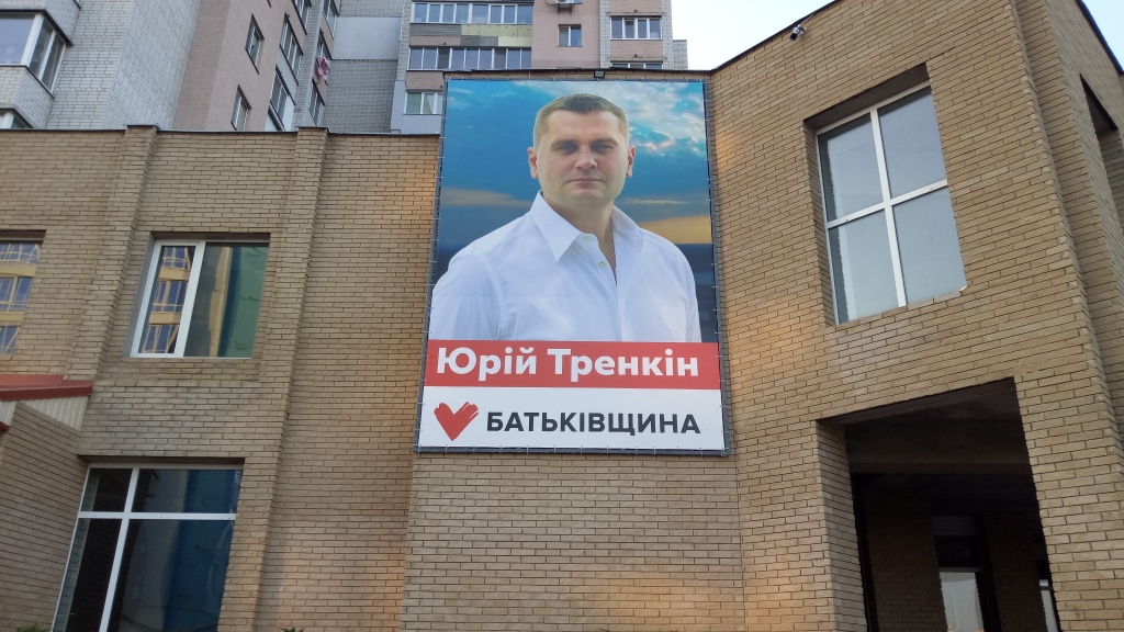 На будівлі за адресою вул. Богдана Хмельницького 61 розміщені банери без вихідних даних із зображенням кандидата в депутати до Черкаської обласної та міської рад від партії ВО “Батьківщина” Юрія Тренкіна та логотипами партії.