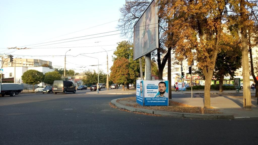 Орієнтовно за адресою бульв. Шевченка 338 та на фасаді ТРЦ “Pioneer” на розі Митницької та бульв. Шевченка розміщені банери партії ВО “Черкащани” без вихідних даних. Білборди із тим же порушенням із зображенням кандидатів від ВО “Черкащани” Олега Петренка та Віталія Лаута розміщений орієнтовно за адресою вул. Героїв Дніпра 1.