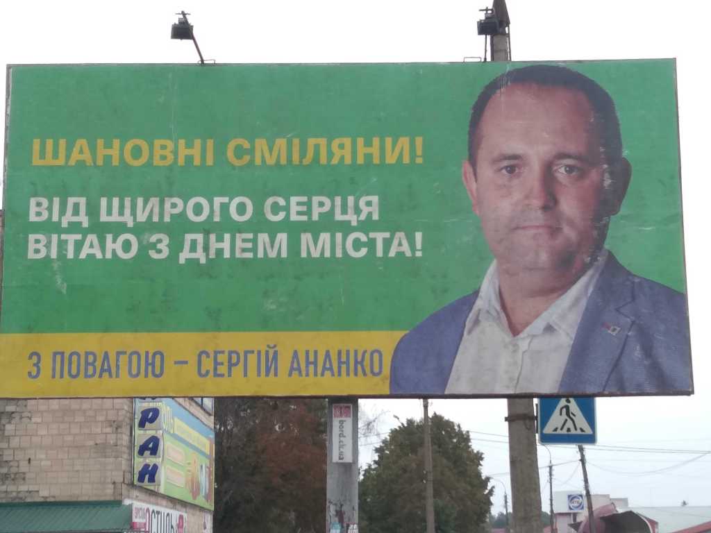 У м. Сміла спостерігачі звернулися до поліції через білборди без вихідних даних партії “Європейська солідарність”,  кандидата на посаду міського голови від партії “Слуги Народу” Сергія Ананка розташовані на перехресті вулиць Соборної  та Чорновола та рекламний плакат партії "Команда Сергія Рудика. Час змін!" на житловому будинку по вул. Соборна 34.