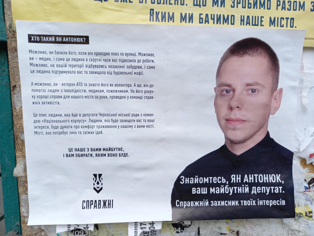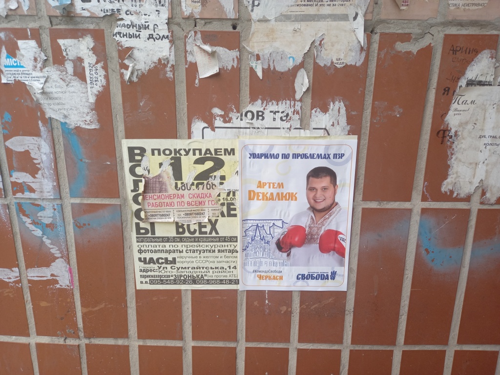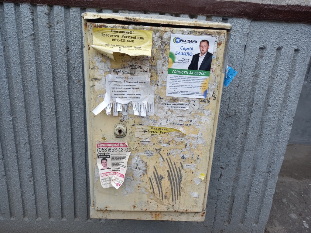 Окрім того було зафіксовано розміщення на дошках оголошень побіля житлових будинків агітаційних листівок без вихідних даних кандидата в депутати Черкаської міської ради від партії “Національний корпус” Яна Антонюка та листівок без вихідних даних кандидата від партії ВО “Черкащани”. Також спостерігачі повідомили про розміщені на стінах житлового будинку листівки без вихідних даних із ймовірним порушенням правил благоустрою кандидата в депутати Черкаської міської ради від партії ВО “Свобода”. На електроопорах розміщені листівки без вихідних даних його однопартійця Віталія Андрейка.