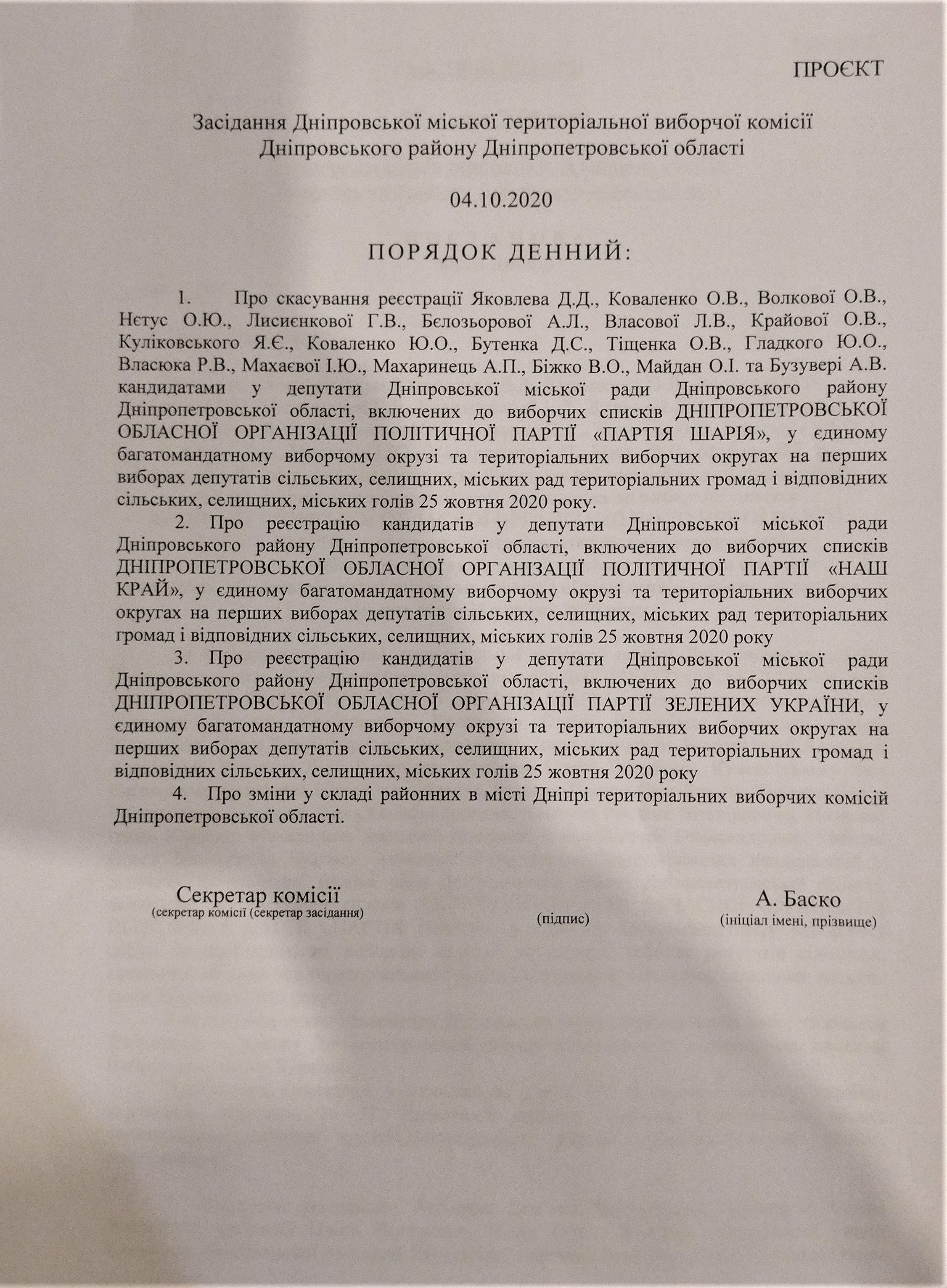 Дніпровська міська ТВК на виконання рішень судів зареєструвала ще дві партії. До Новомосковської та Кам’янської міських ТВК викликали поліцію через втручання в роботу комісії та зникнення документів. Кам’янська міська ТВК звернулася до правоохоронців щодо можливої підробки особистих підписів.