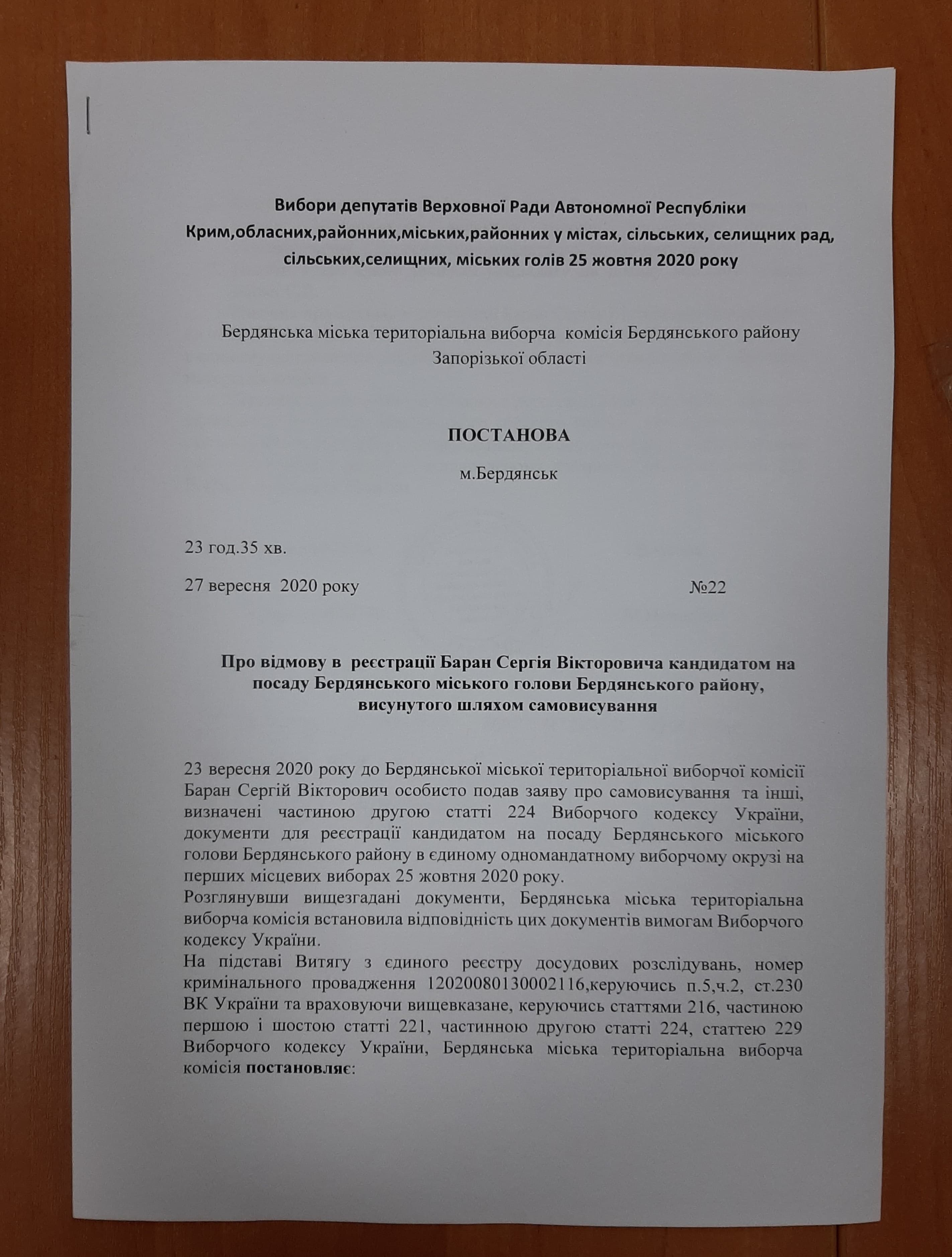 Відмову в реєстрації кандидатом на посаду Бердянського міського голови також отримав кандидат зі схожим прізвищем – Баран Сергій Вікторович. Це зазначено в постанові ТВК №22 від 27 вересня 2020 року 23 год. 35 хв.
