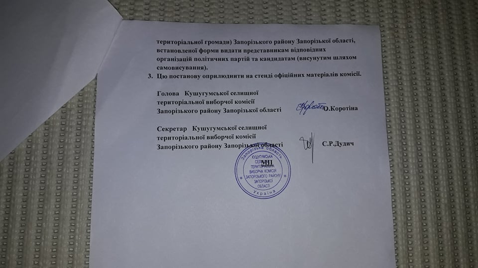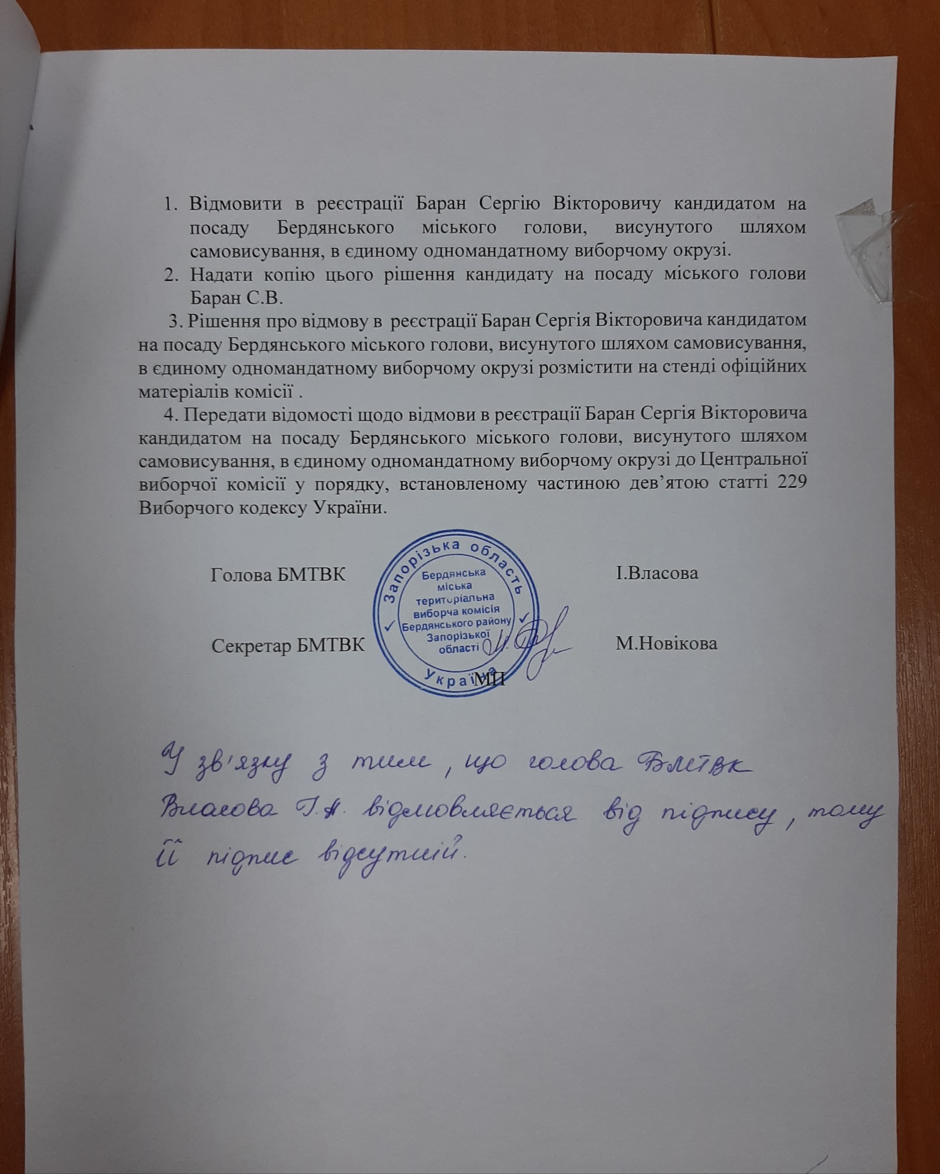 На цій постанові, як і на всіх вище зазначених, відсутній підпис голови Бердянської міської ТВК Інни Власової. На двох із них відсутня печатка, а також немає підпису секретарки комісії. Саме в такому вигляді комісія надала ОПОРІ відповідні документи. Як йдеться в постанові вище за єдиним підписом – підписом секретарки Марії Новікової, – у зв’язку з тим, що голова ТВК Власова І.А. відмовляється підписувати документи, тому її підпис відсутній. Однак дати офіційний коментар з цього приводу секретарка відмовилася.
