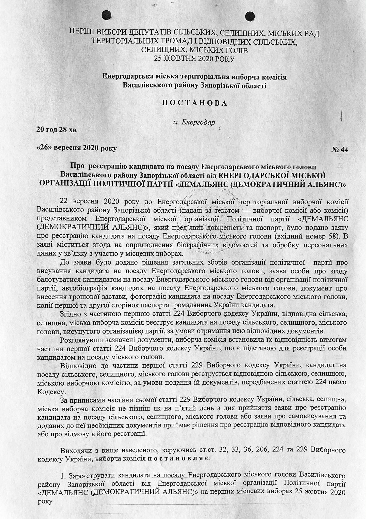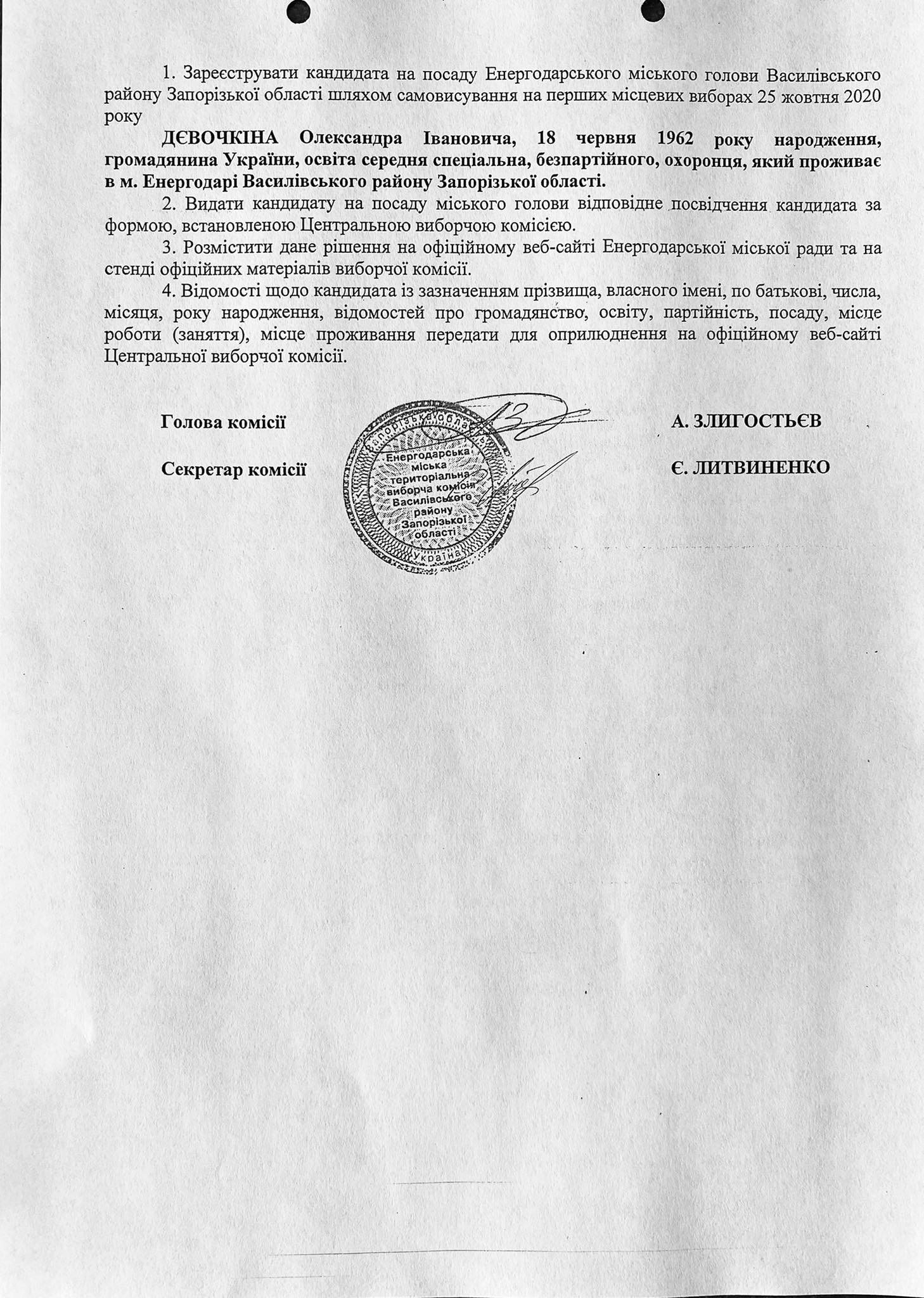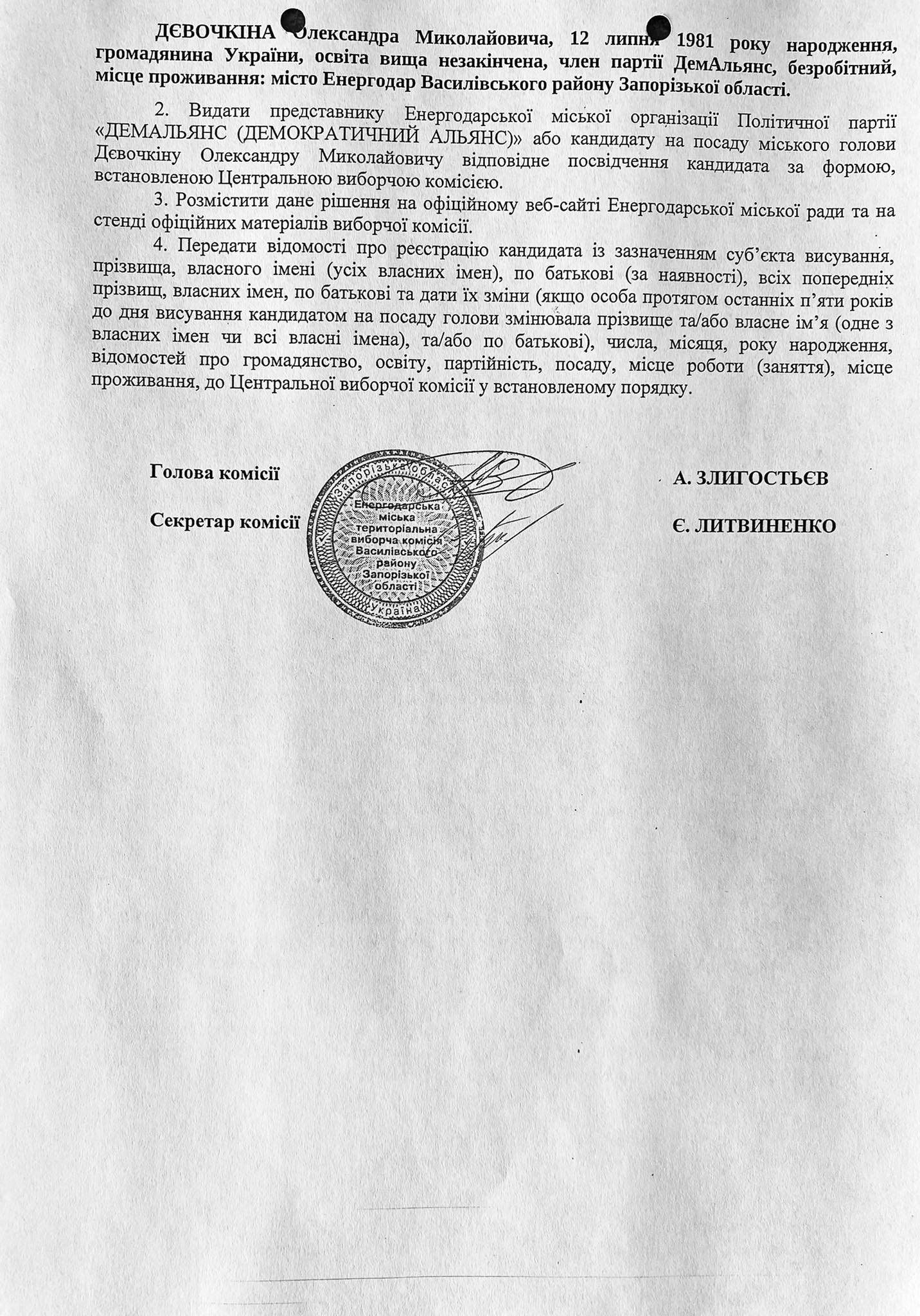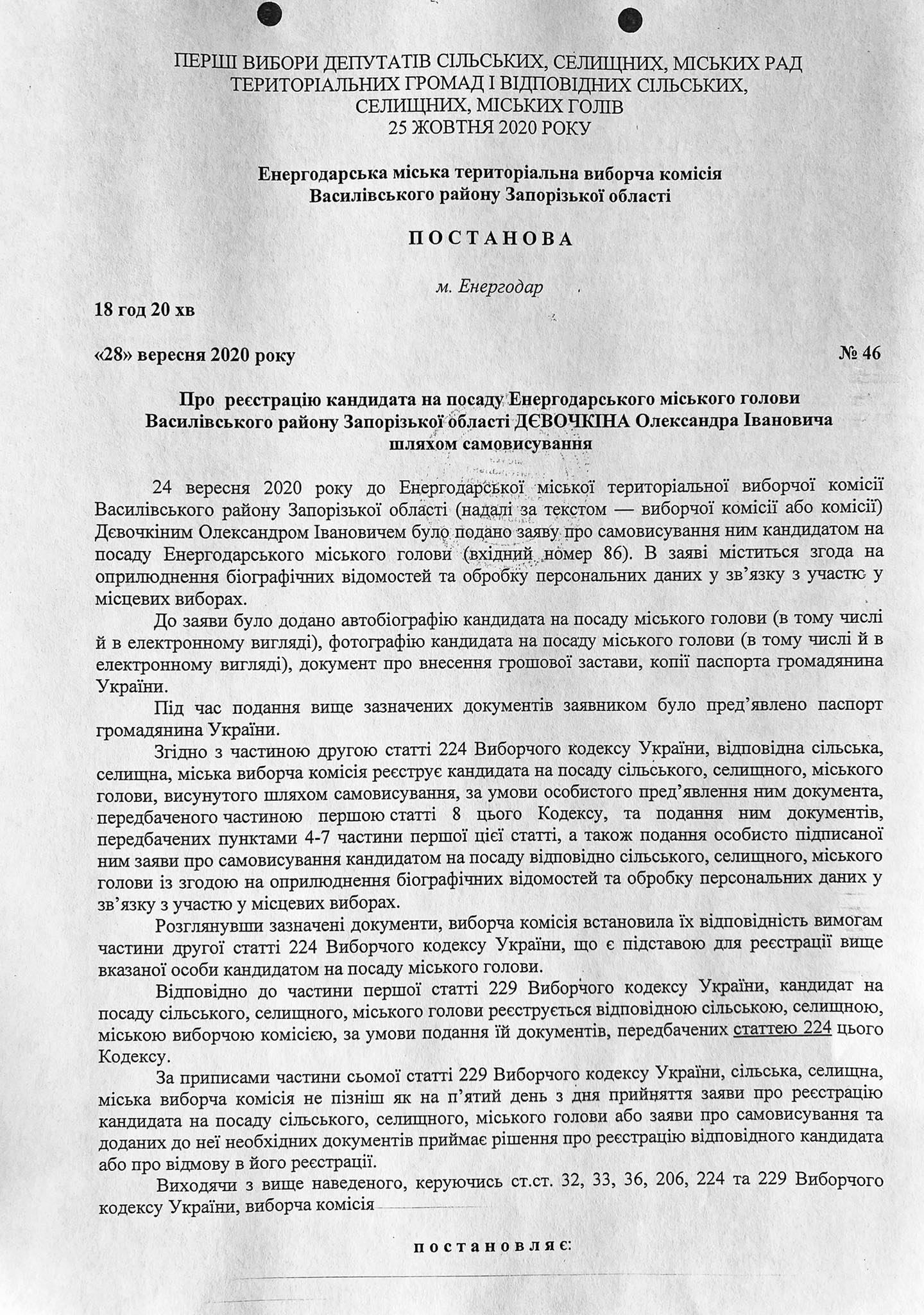 А ось другий Олександр Дєвовочкін, але з іншим по-батькові - Іванович подав до комісії заяву про самовисування і отримав підтвердження про реєстрацію як кандидата на посаду мера Енергодара 28 вересня, 18 год. 20 хв. Про цей йдеться в постанові ТВК №46.