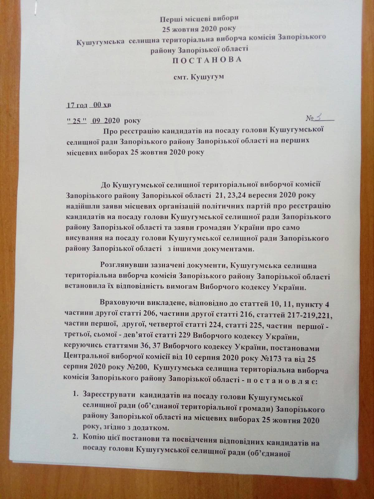Відповідно до постанов територіально виборчої комісії усім трьом кандидатам було відмовлено в реєстрації на підставі витягу з єдиного реєстру досудових розслідувань, номер кримінального провадження 12020080130002116,керуючись п.5,ч.2, ст.230 ВК України та враховуючи вищевказане, керуючись статтями 216, частиною першою і шостою статті 221, частинною другою статті 224, статтею 229 Виборчого кодексу України.