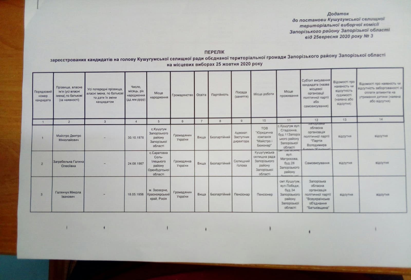 Так, відповідно до постанови №3 від 25 вересня 2020 року, 17:00 селищна ТВК зареєструвала Майстро Дмитра Миколайовича кандидатом на посаду Кушугумської селищної ради територіальної громади від політичної партії «Партія Володимира Буряка «Єднання».