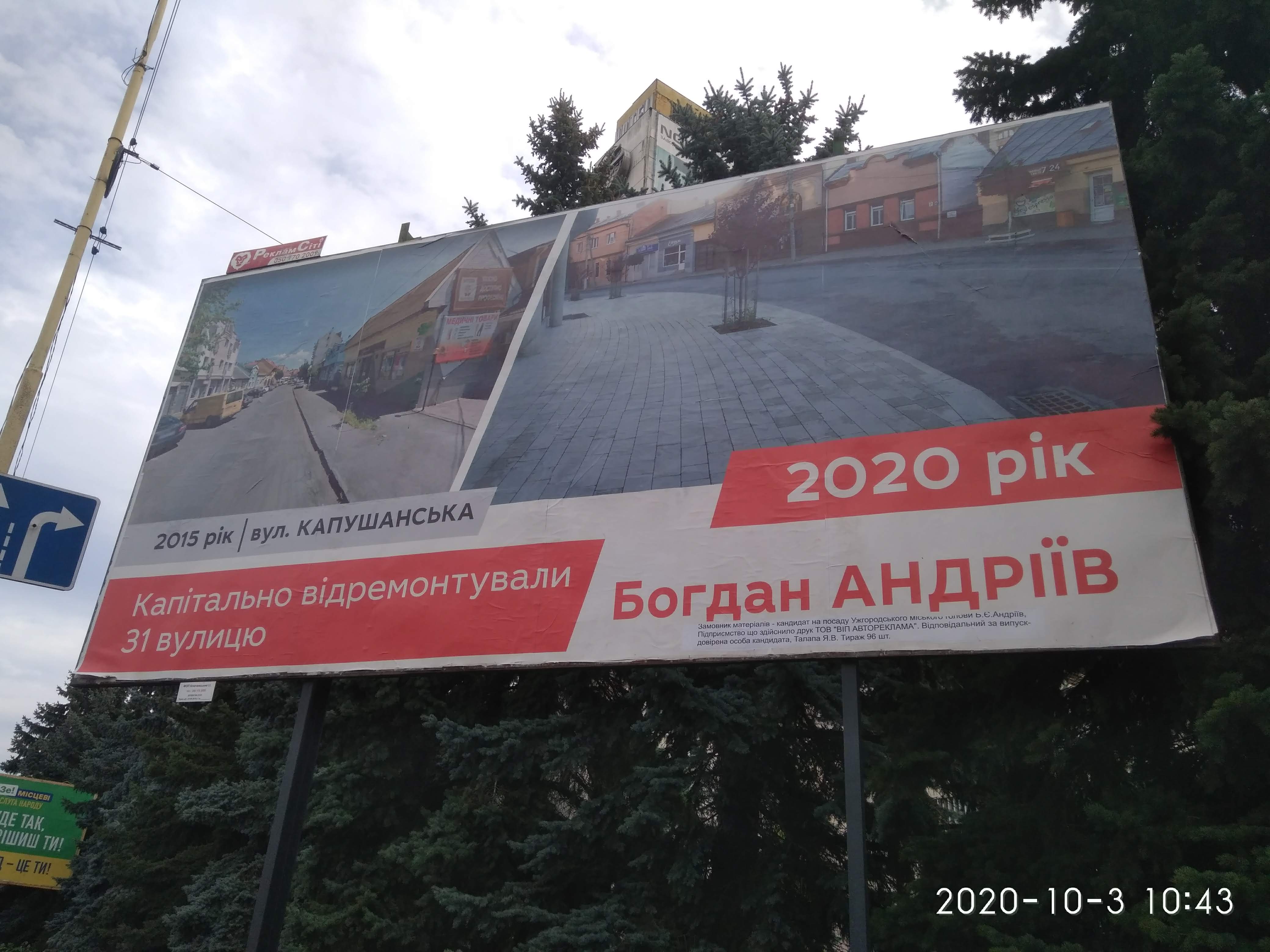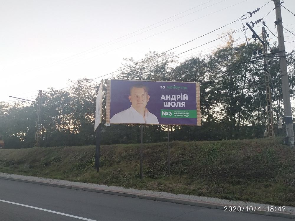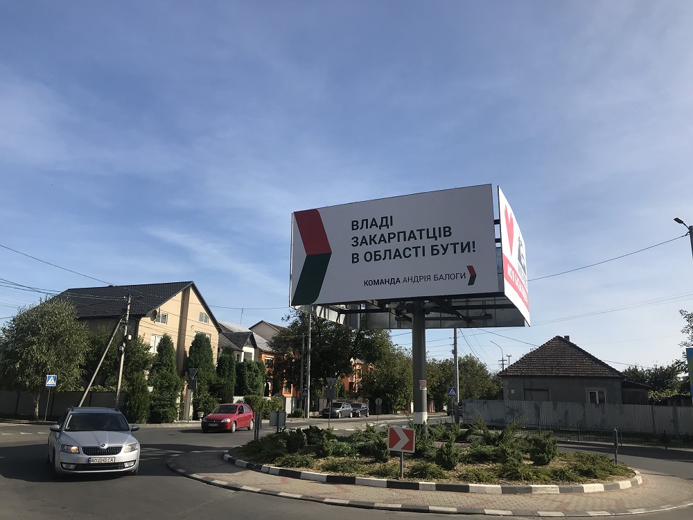 На вулицях Закарпаття спостерігачі ОПОРИ продовжують фіксувати білборди окремих політичних сил без вихідних даних – інформації про установу, що здійснила друк, тираж, замовника тощо. Також спостерігачі фіксують як кандидати, які володіють або асоціюються із бізнес-проєктами, використовують свої бізнес-активи, зокрема – як майданчик для розміщення друкованої агітації . Крім цього, як зафіксували спостерігачі ОПОРИ, білборди окремих політичних сил в Ужгороді невідомі обливають фарбою.