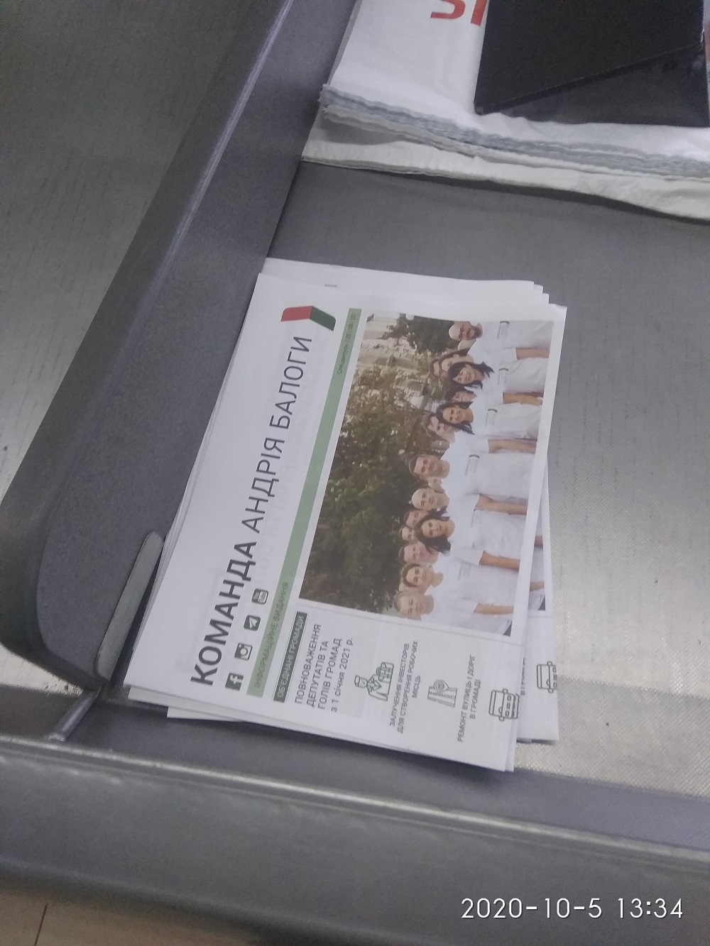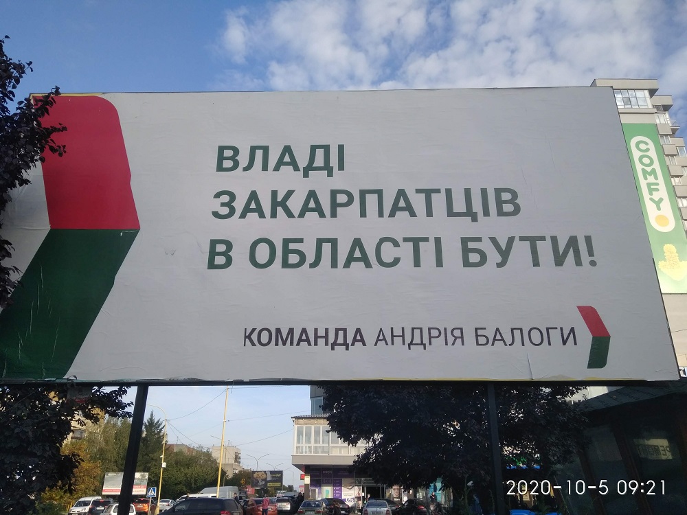 Станом на 5 жовтня в Ужгороді та Мукачеві спостерігачі ОПОРИ зафіксували білборди із символікою політичної партії «Команда Андрія Балоги», на яких немає вихідних даних – інформації про тираж, замовника, установу, що здійснила друк тощо. Оскільки партія є офіційним учасником виборчого процесу, спостерігачі ОПОРИ поскаржилися з цього приводу до поліції.