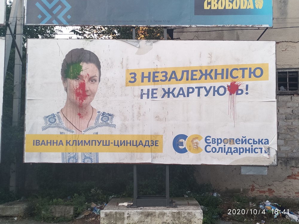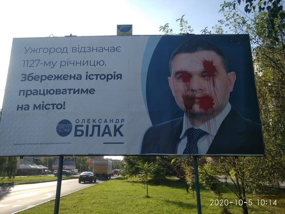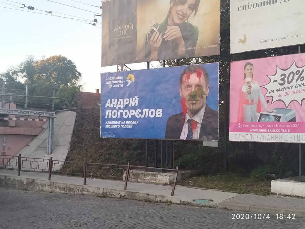 5 жовтня на кількох вулицях Ужгорода спостерігачі ОПОРИ зафіксували зіпсовані білборди політичної партії «Рідний дім» та кандидата від цієї політсили на посаду міського голови – Олександра Білака, політичних партій «Європейська солідарність», «Опозиційна платформа – За життя» й кандидата Андрія Погорєлова, «За майбутнє» й кандидата Андрія Шолі. Агітаційні борди із символікою цієї партії невідомі облили червоною фарбою. Також зіпсований борд Ростислава Приходька ОПОРА виявила й на території Оноківської громади.