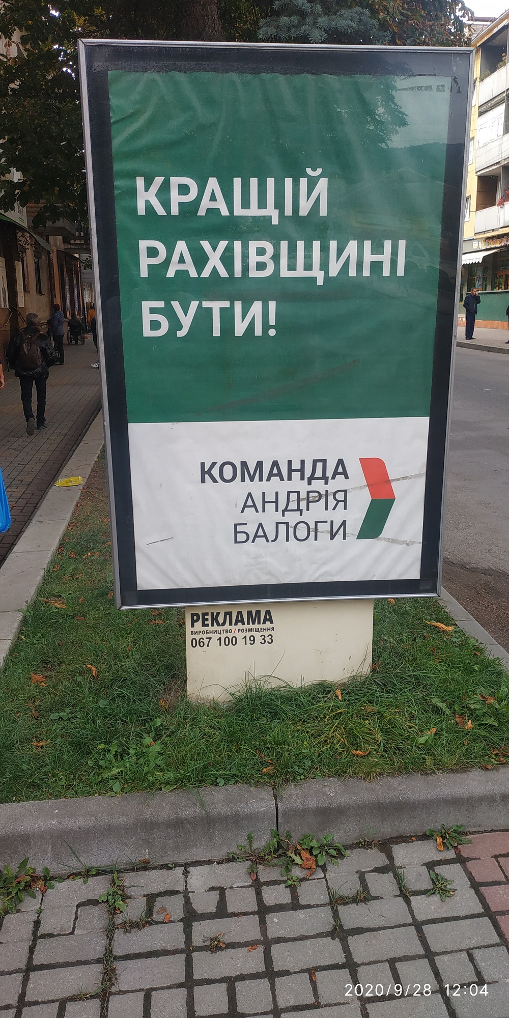 У Рахові спостерігач ОПОРИ у перші дні жовтня зафіксував сітілайти із символікою партій «Сила і честь» та «Команда Андрія Балоги», ВО «Батьківщина» без вихідних даних, однак за інформацією спостерігача, ці рекламні носії були встановлені ще у вересні. На білборді «Європейської партії України», що розміщений, ймовірно, ще із серпня, адже на ньому є привітання із Днем Незалежності України, доклеїли вихідні дані. Також доклеєні вихідні дані з’явилися на бордах чинного міського голови Ужгорода Богдана Андріїва.