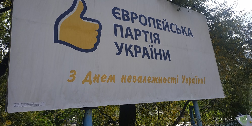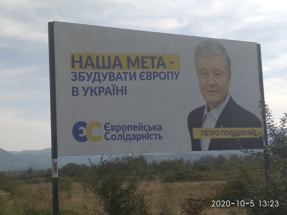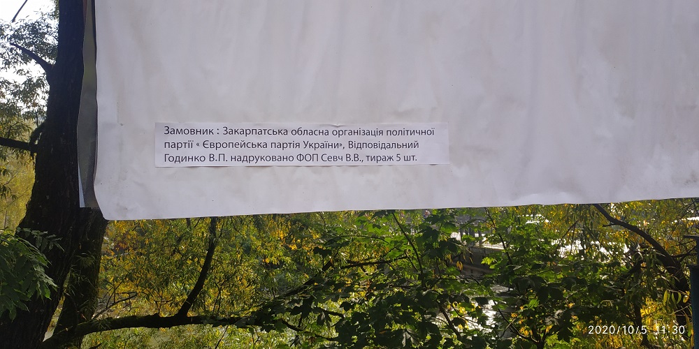 Також 5 жовтня у Тячівському районі спостерігач ОПОРИ виявив білборди без вихідних даних із символікою політичної партії «Європейська солідарність» та ВО «Батьківщина».