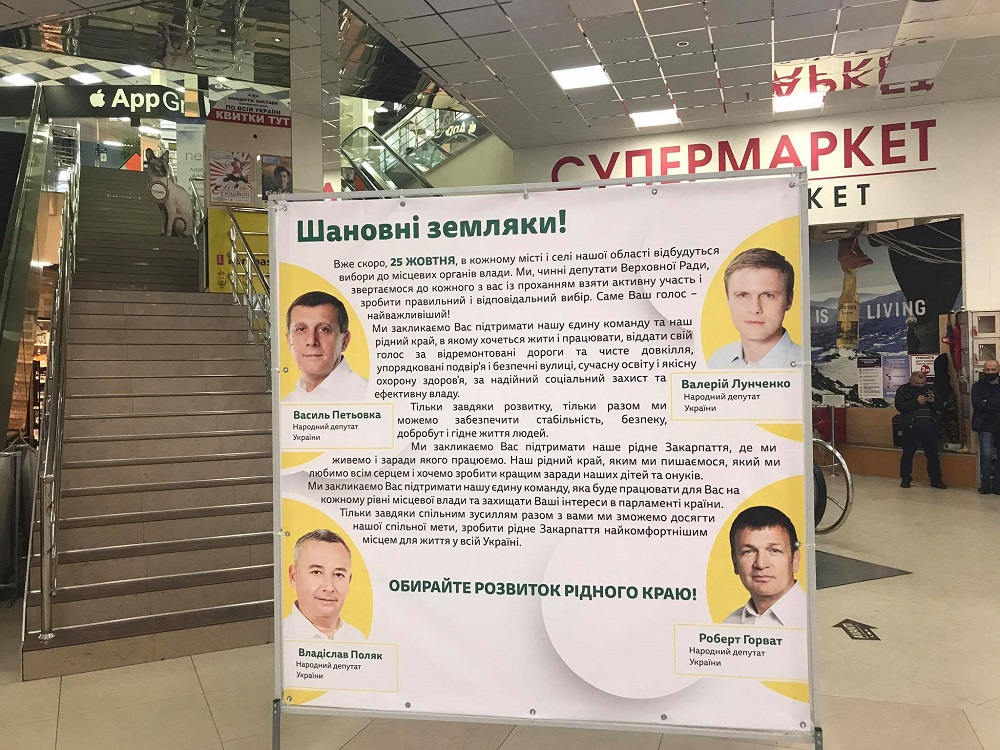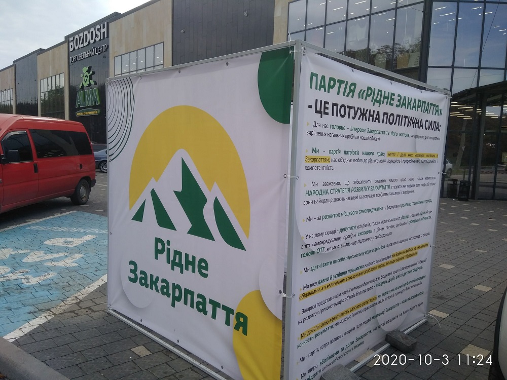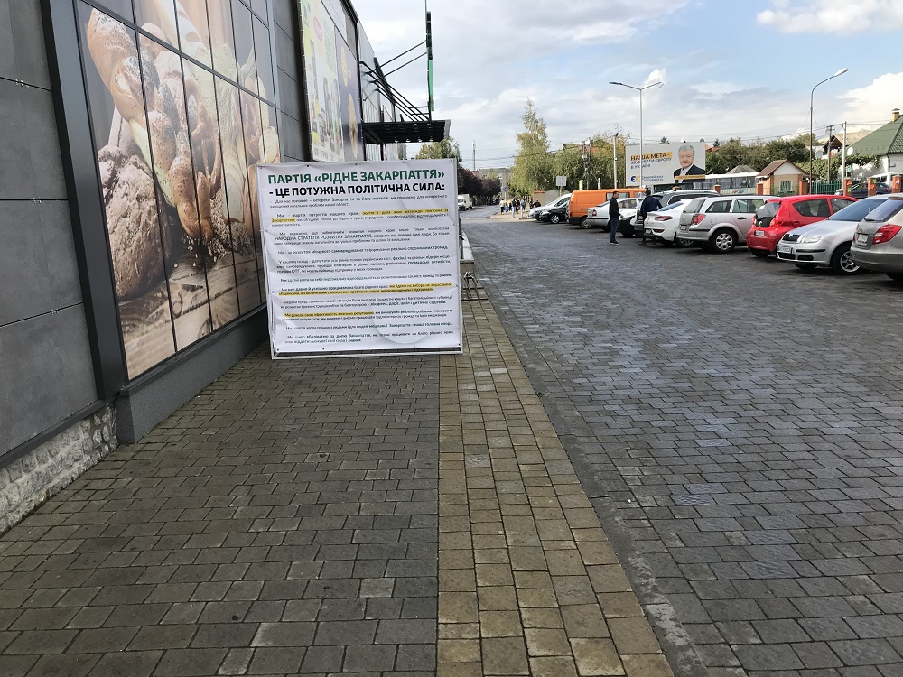 Крім цього, в Ужгороді та Мукачеві ОПОРА зафіксувала агітаційні «куби» політичної партії «Рідне Закарпаття» без вихідних даних. Зокрема, їх розмістили біля супермаркетів «Алма» в Ужгороді та Мукачеві, власником яких називає себе Андрій Лукач – кандидат в міські голови Мукачева від партії «Рідне Закарпаття», на території супермаркету «Дастор» в Ужгороді, власність якого пов’язують із нардепом Робертом Горватом та біля закладу громадського харчування на проспекті Свободи в Ужгороді, власність якого пов’язують із одним із кандидатів партії в депутати Ужгородської міськради від «Рідного Закарпаття».