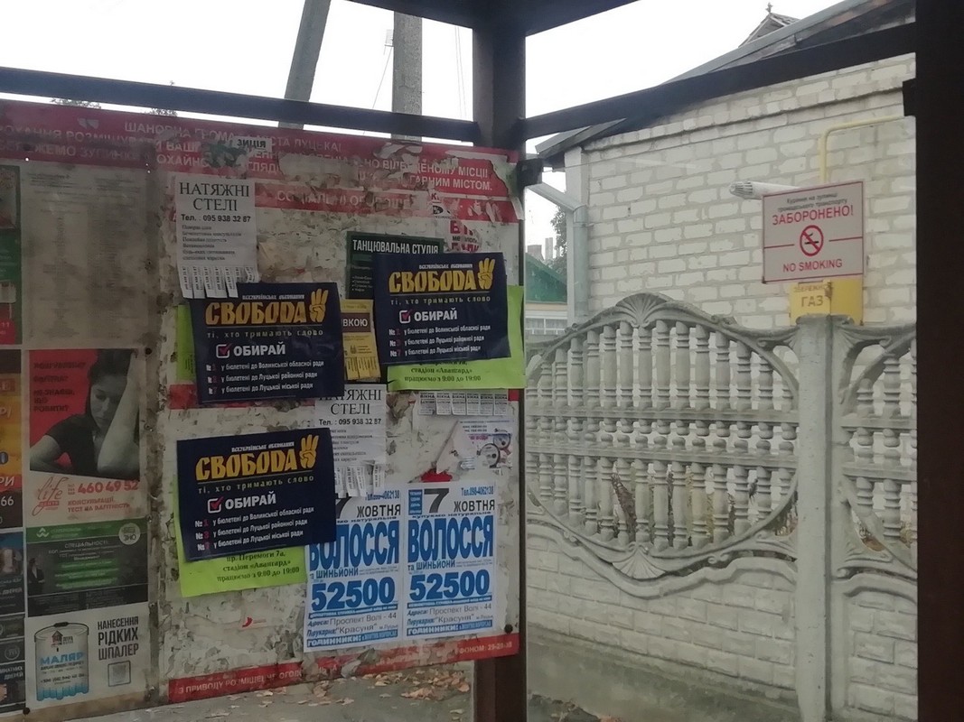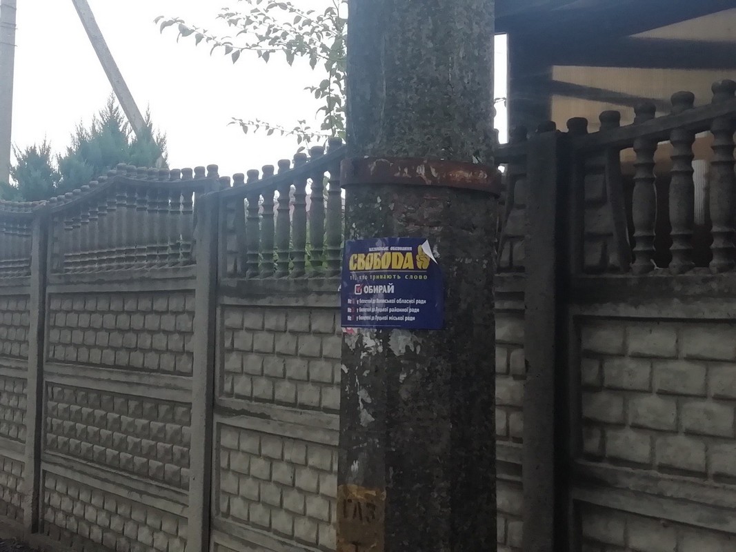 9 жовтня спостерігач ОПОРИ виявив листівки на користь ВО «Свобода», розміщені у заборонених законом місцях. Зокрема, друковану продукцію розмістили на низці електроопор на вулицях Володимирській та Львівській, а також на зупинці громадського транспорту на вулиці Львівській. Розміщення друкованої агітаційної продукції на зупинці громадського транспорту суперечить частині 17 статті 57 Виборчого кодексу України.