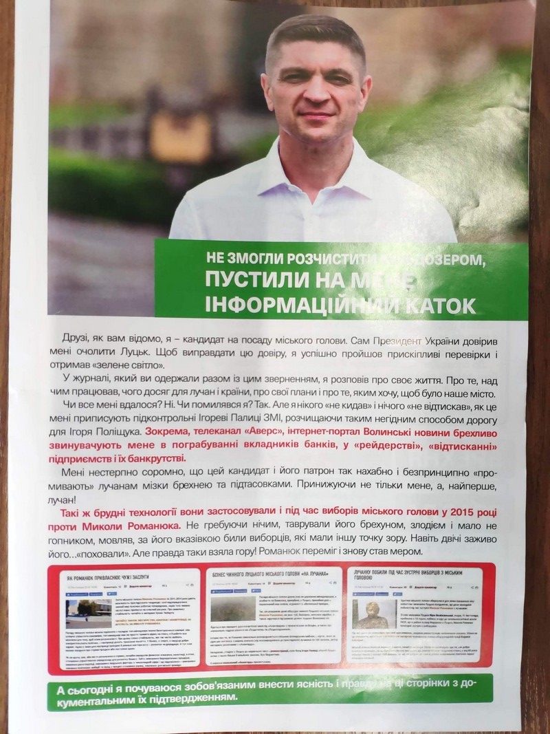 Днем раніше, 8 жовтня, представникам ОПОРИ стало відомо про поширення друкованих агітаційних матеріалів із зображенням кандидата Романа Бондарука поблизу вул. Потебні невідомими особами. Йдеться про листівку у «фірмових» кольорах партії, із фото та іменем, прізвищем кандидата, а також гаслом «Європу» – в кожен двір!». Інший же містив фото кандидата та його звернення і спростування інформації, котру розміщували окремі волинські медіа.