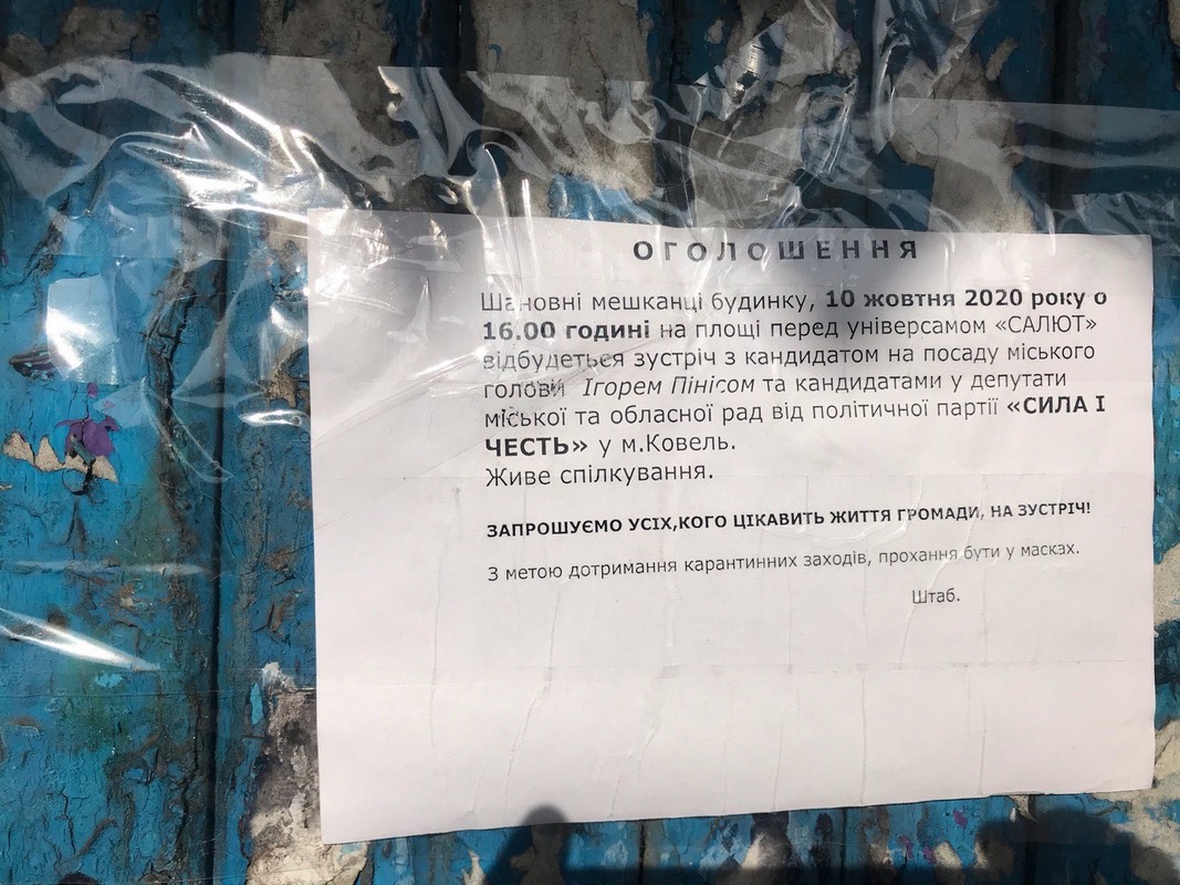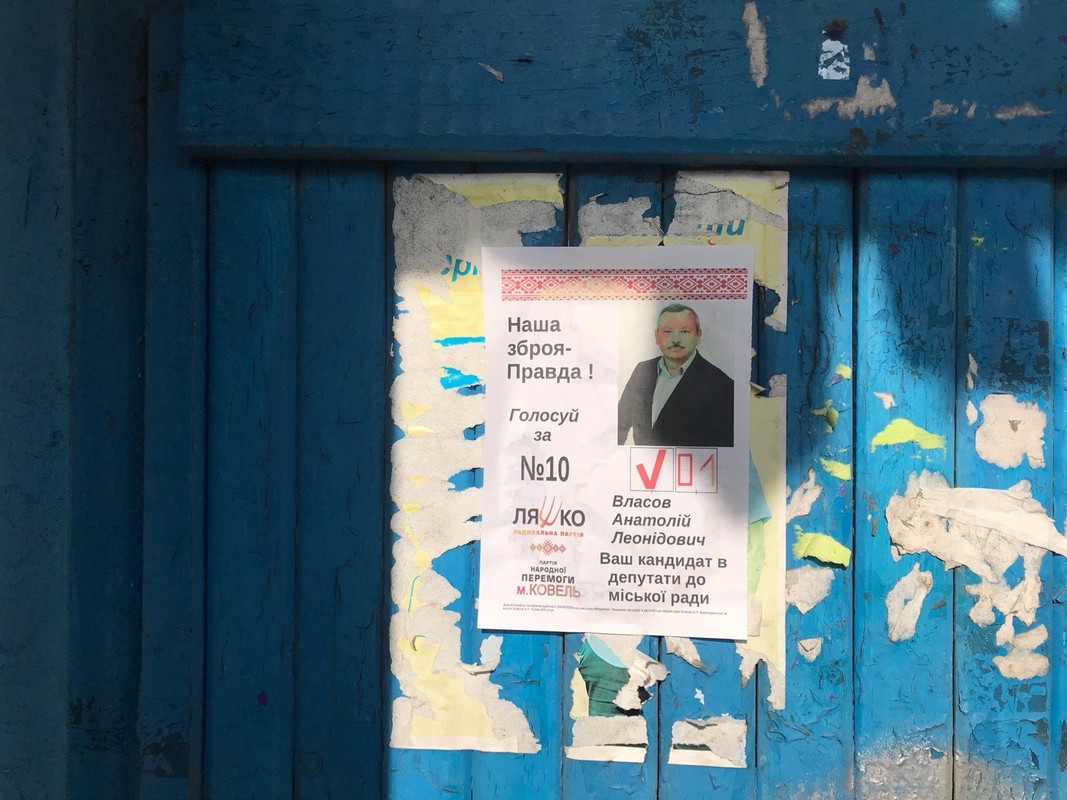 Також 9 жовтня у Ковелі на зупинці громадського транспорту виявили агітаційні постери на користь кандидата на посаду Ковельського міського голови Олександра Геча (самовисування) та кандидата у депутати Ковельської міськради Анатолія Власова (Радикальна партія Олега Ляшка). На цій же зупинці було наклеєне оголошення-анонс зустрічі із кандидатом у депутати міської ради Ігорем Пінісом («Сила і Честь»).