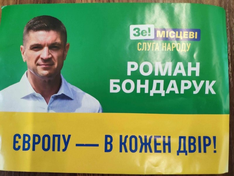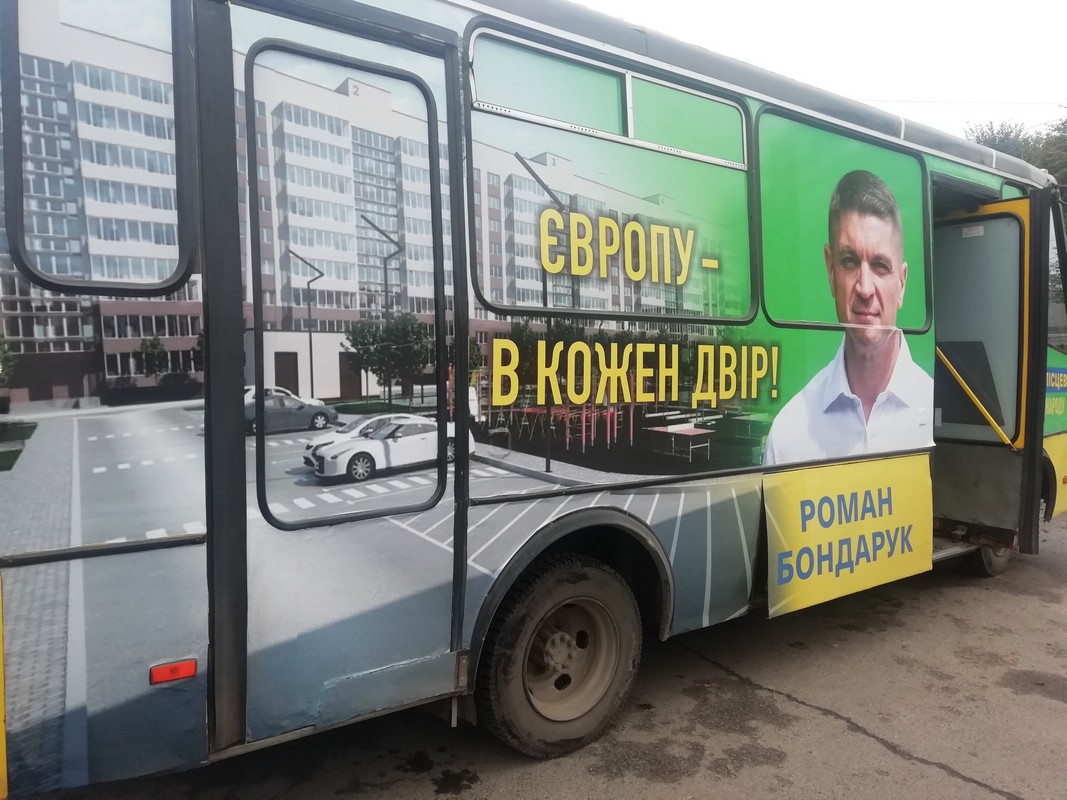 Проте матеріали, котрими обклеєний транспортний засіб, мали зображення Романа Бондарука, а також надпис «Зе! Місцеві. Слуга народу. Європу – в кожен двір!», та не містили вихідних даних. Тож спостерігач ОПОРИ викликав на місце правоохоронців.