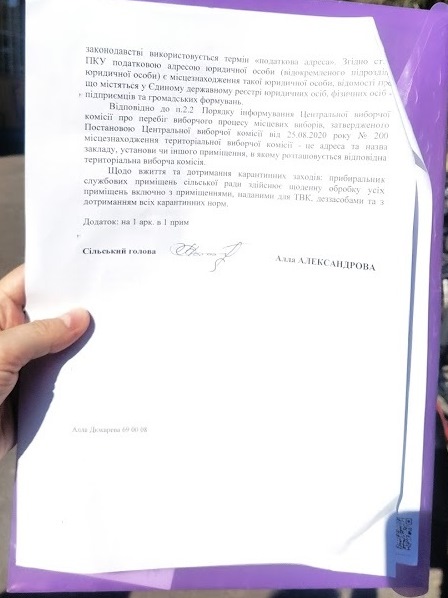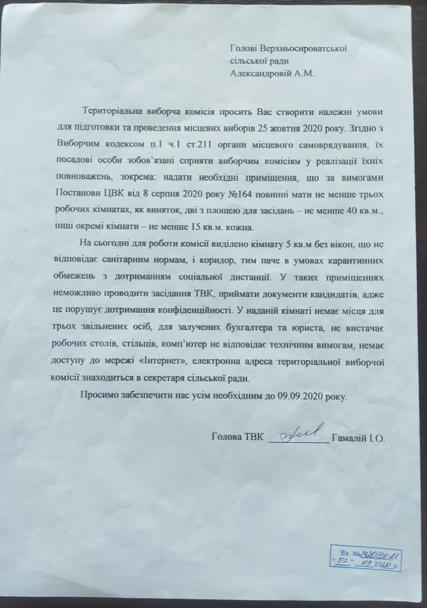 За словами Ірини Гамалій, приміщення не відповідає вимогам, встановленим постановою Центральної виборчої комісії № 164 і включає в себе дві кімнати та коридор в будівлі сільської ради. Саме останній і призначений для проведення засідань, проте дотриматись санітарних норм щодо дистанціювання у ньому неможливо. Окрім цього, в коридорі також неможливо проконтролювати присутність на засіданнях осіб, які не мають на це право. Наразі ТВК змушена проводити засідання в коридорі або на вулиці поблизу будівлі.
