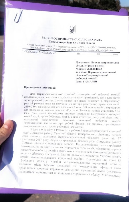 У коментарі для ОПОРИ голова ТВК зазначила, що зверталась для вирішення проблеми до голови Верхньосироватської сільської ради Алли Александрової, проте отримала лише формальну відповідь. Крім того, Ірина Гамалій зверталась до поліції щодо невідповідності нормам законодавства умов у приміщенні, до державної споживчої служби із заявою щодо дотримання санітарних норм у приміщенні та до пожежної інспекції для перевірки вимог пожежної безпеки. Правоохоронні органи досі працюють над цим питанням.