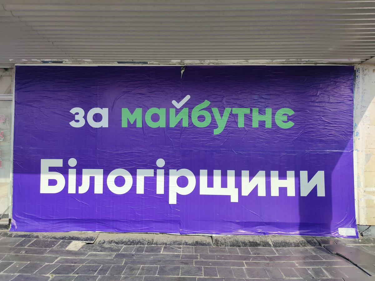 Банер партії «За майбутнє» з доклеєними вихідними даними розміщений на будівлі Білогірського будинку культури. Про цей банер, вперше зафіксований спостерігачем 24 вересня, ОПОРА вже повідомляла, оскільки Виборчий кодекс України (частина 16 статті 57) забороняє розміщення агітаційних матеріалів на приміщеннях комунальної власності. Тоді жодних вихідних даних на рекламі не було.