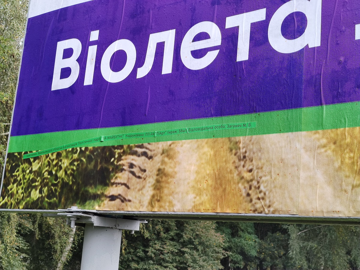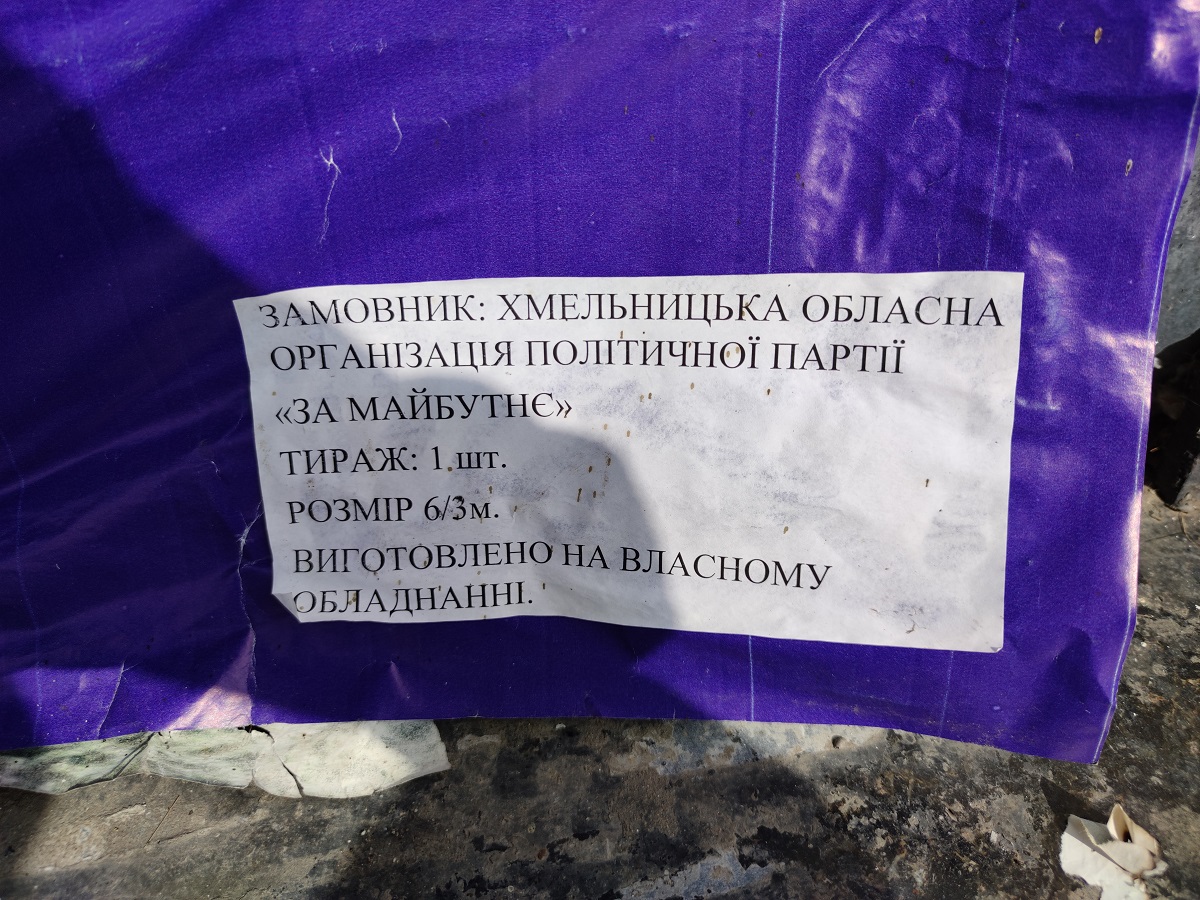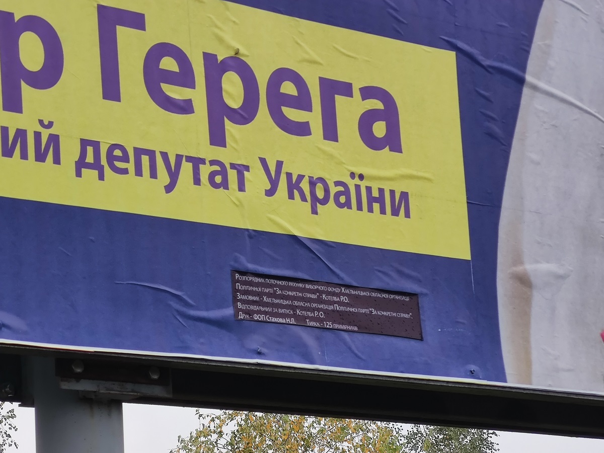У різних містах Хмельниччини спостерігачі ОПОРИ впродовж 5-10 жовтня зафіксували білборди кандидатів та політичних сил з доклеєними вихідними даними. У такий спосіб додали визначені виборчим законодавством обов’язкові відомості до зовнішньої реклами як окремих кандидатів, так і політичних сил.