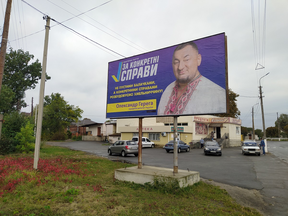 У містах Красилові, Кам’янці-Подільському, а також неподалік села Чернелівки та в місті Славуті доклеїли вихідні дані на білборди із зображенням народного депутата Олександра Гереги, який балотується до Хмельницької обласної ради від партії «За конкретні справи».