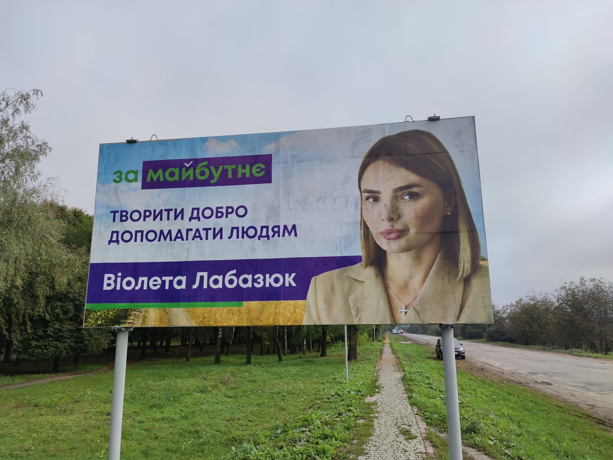 У Красилові доклеєні вихідні дані спостерігач ОПОРИ зафіксував на двох білбордах кандидатки в депутати Хмельницької обласної ради від партії «За майбутнє» Віолети Лабазюк. Білборди кандидатки з доклеєними вихідними даними ОПОРА також виявила в Теофіполі.