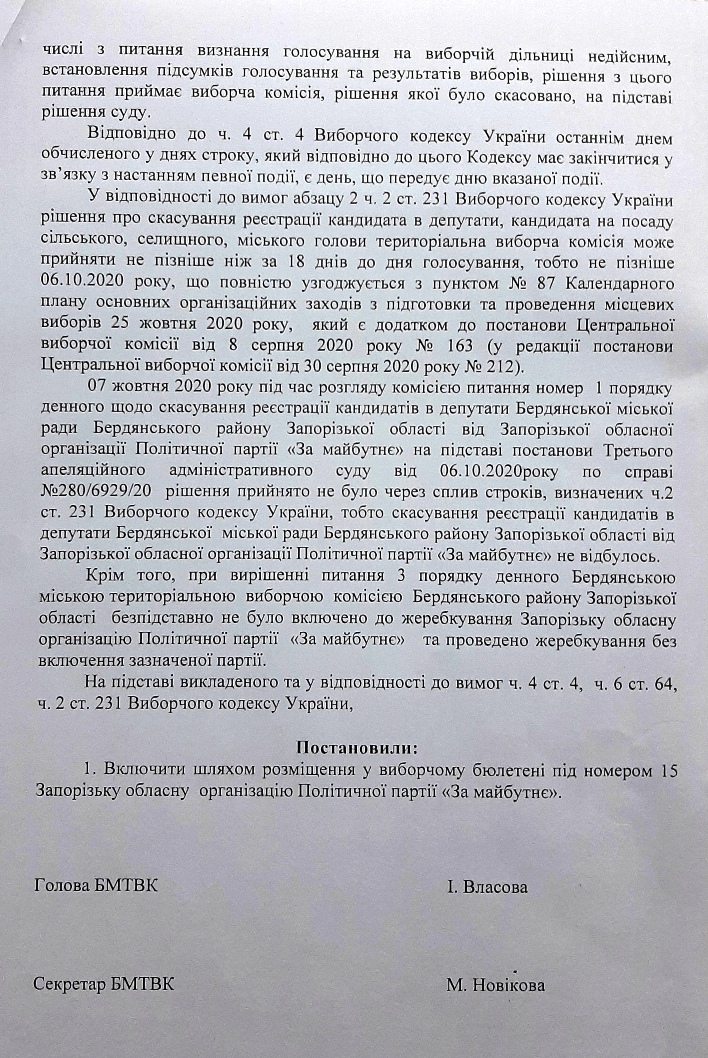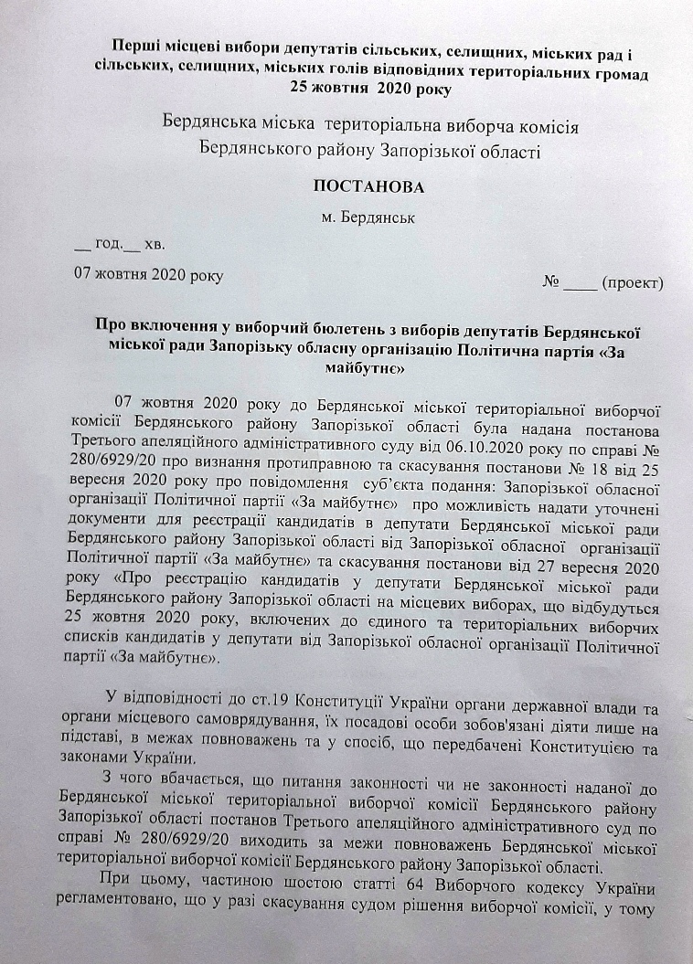 7 жовтня Бердянська міська виборча комісія Бердянського району Запорізької області розглянула перший пункт порядку денного. Під ним йшло ознайомлення із постановою Третього апеляційного адміністративного суду від 6 жовтня 2020 року по справі 280/6929/20 про визнання протиправними та скасування постанов від 25 вересня та 27 вересня згаданої ТВК. Таким чином Бердянську міську комісію зобов’язали скасувати реєстрацію кандидатів у депутати Бердянської міськради включених до єдиного та територіального виборчого списків від Запорізької обласної організації політичної партії «За Майбутнє». В документі зазначалося, що на підставі постанови суду, яка набрала законної сили – судове рішення є обов’язковим для виконання. Бердянська міська ТВК як особа, якій належить виконати судовий акт, повинна вчинити достатні дії для виконання процесу незалежно від будь-яких умов.