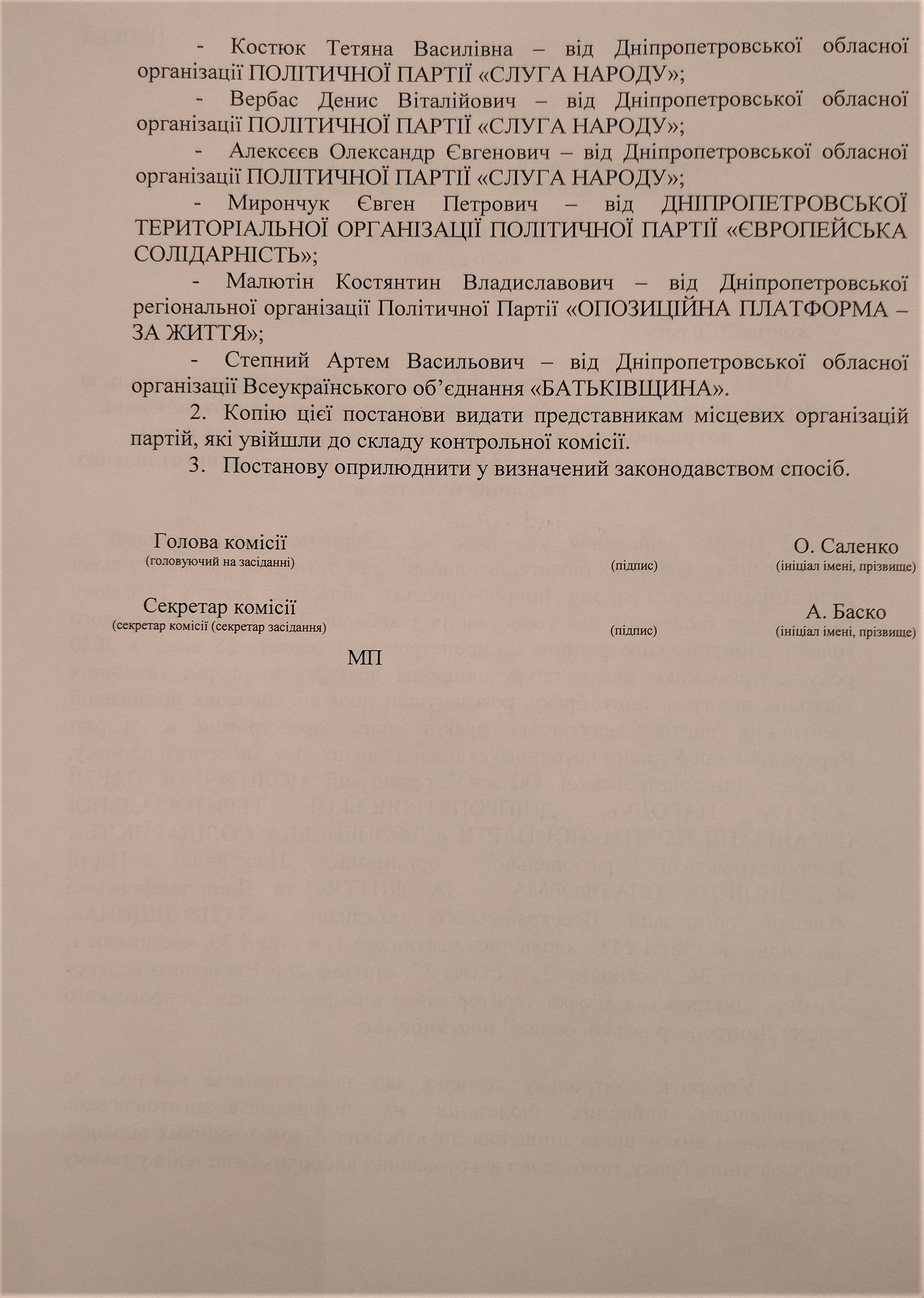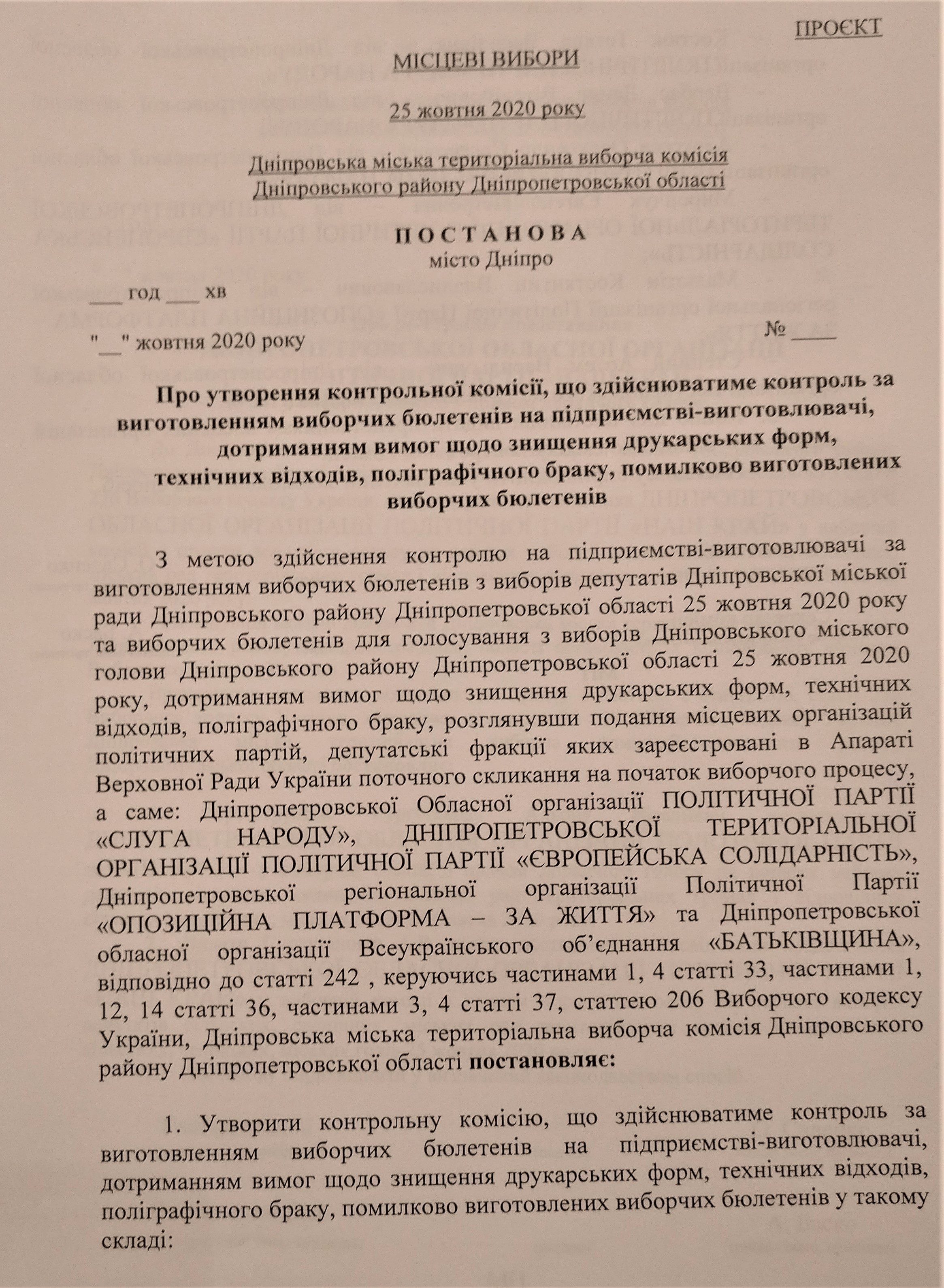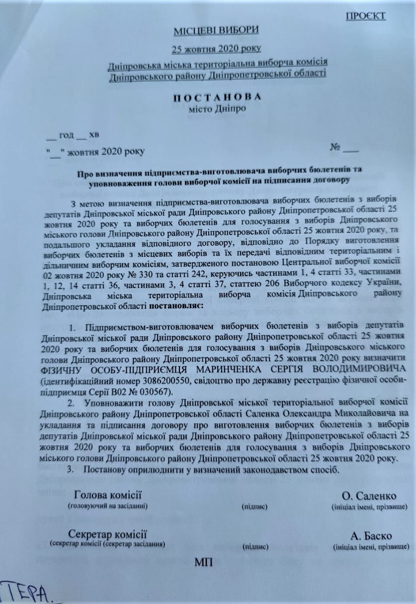 У постанові Дніпровської міської ТВК написано, що підприємство-виготовлювач виборчих бюлетенів – фізична особа-підприємець Сергій Маринченко. Адреса реєстрації ФОП – Херсонська область, смт. Велика Олександрівка. До контрольної комісії, що здійснюватиме контроль за виготовленням виборчих бюлетенів увійшли 3 представники від партії «Слуга народу», по одному від партій «Європейська солідарність», «Опозиційний блок – За життя», ВО «Батьківщина».