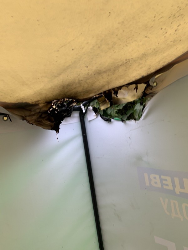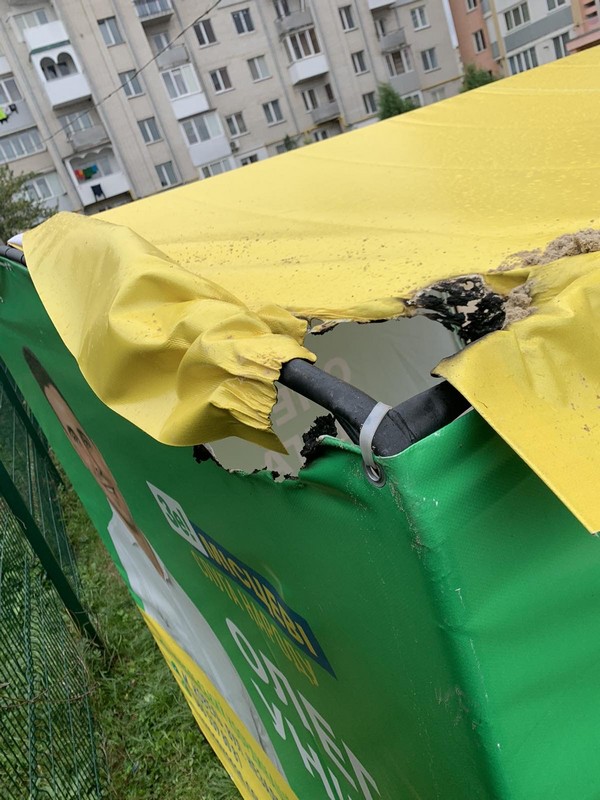«Охоронець побачив, що хтось підпалив намет. Він почав горіти, але йшов дощ, та й сам брезент такий, що треба розгорітися, тому коли охоронець побачив, що почав горіти, його загасили піском. Потім вони нам подзвонили – ми приїхали і зафільмували», - розповів кандидата. На час підпалу у наметі нікого не було.