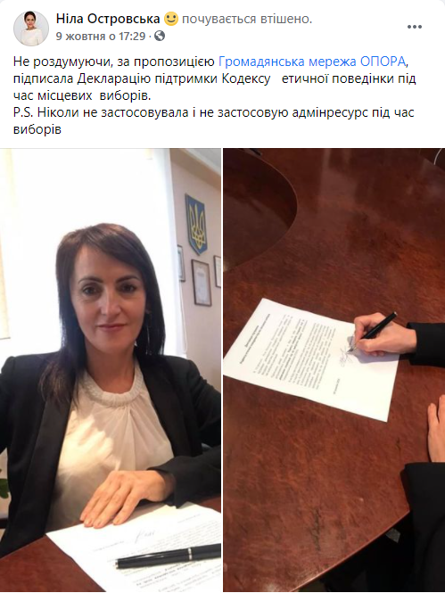 «Не роздумуючи, за пропозицією Громадянська мережа ОПОРА, підписала Декларацію підтримки Кодексу етичної поведінки під час місцевих виборів. P.S. Ніколи не застосовувала і не застосовую адмінресурс під час виборів», – написала очільниця Красилова на своїй сторінці у Facebook 9 жовтня.