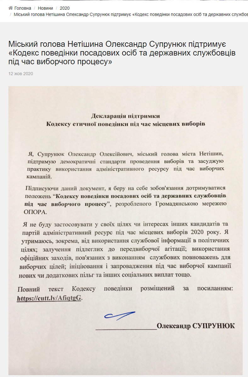 Про підтримку Кодексу повідомив також міський голова Нетішина Олександр Супрунюк. Відповідна інформація розміщена на сайті Нетішинської міської ради 12 жовтня.