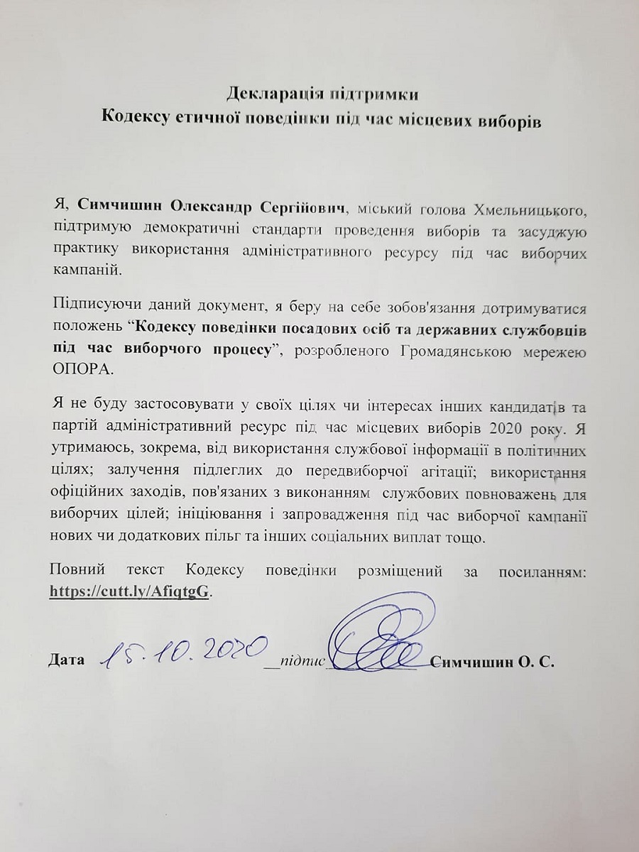 15 жовтня задекларував підтримку Кодексу етичної поведінки міський голова Хмельницького Олександр Симчишин.