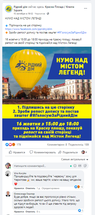 16 жовтня партія «Рідний Дім» катала містян на повітряній кулі, не дивлячись на те, що місто в червоній карантинній зоні вже з 19 жовтня. Спостерігачі ОПОРИ повідомляють, що катання на кулі містить ознаки непрямого підкупу виборців та вже звернулись до поліції з відповідною заявою.
