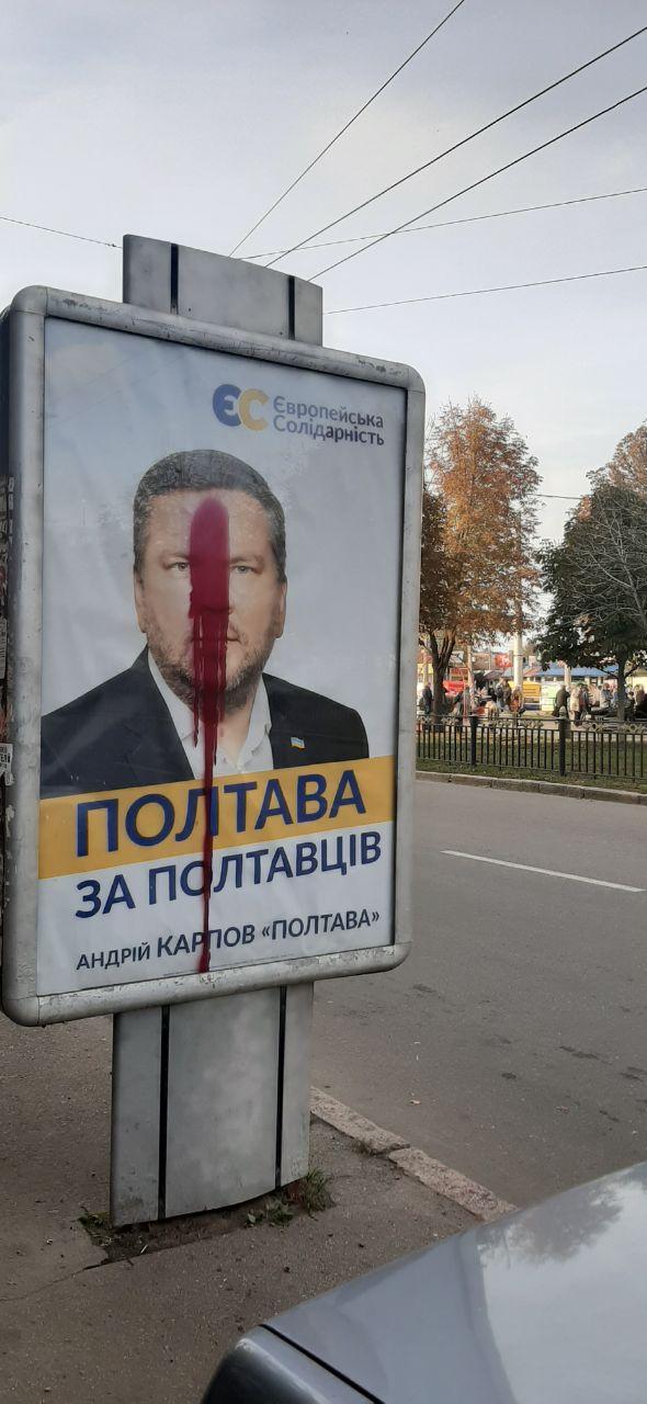 Пошкодженими фарбою виявилися і білборди та сітілайти кандидата на посаду Полтавського міського голови від «Європейської солідарності» Андрія Карпова. В обласному штабі партії повідомили, що теж готують заяву до поліції.