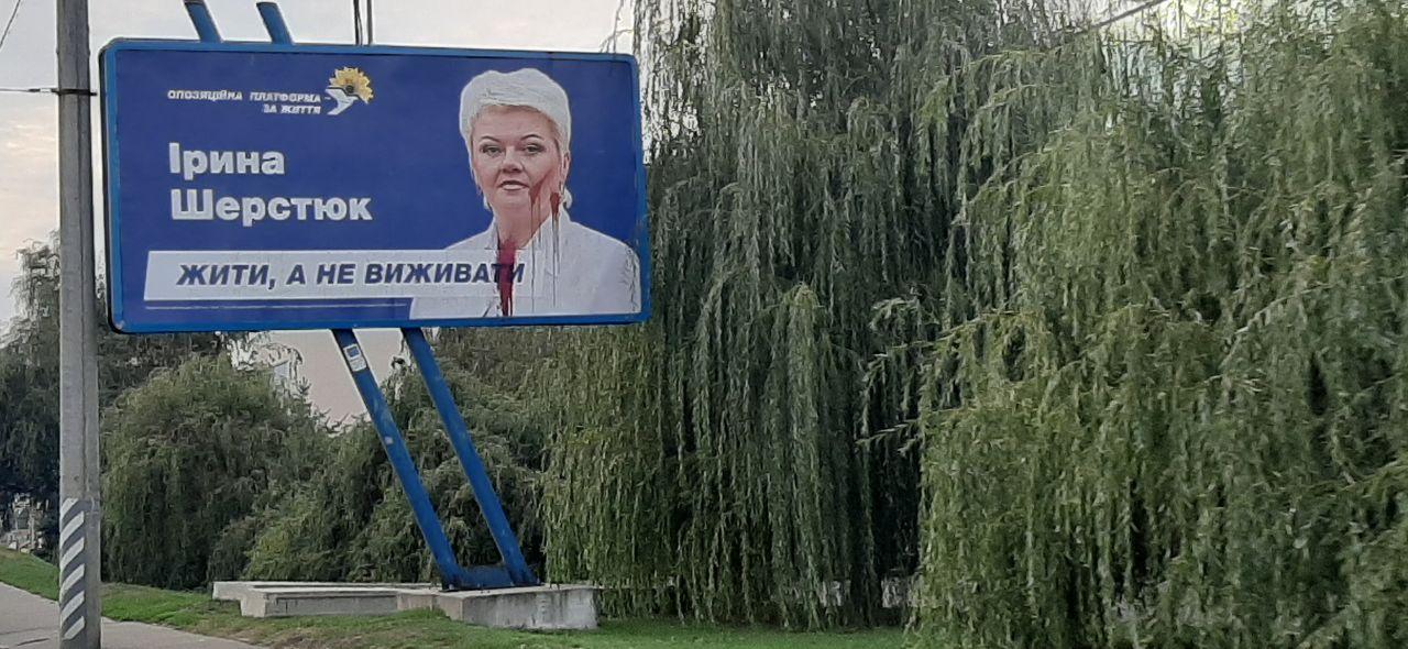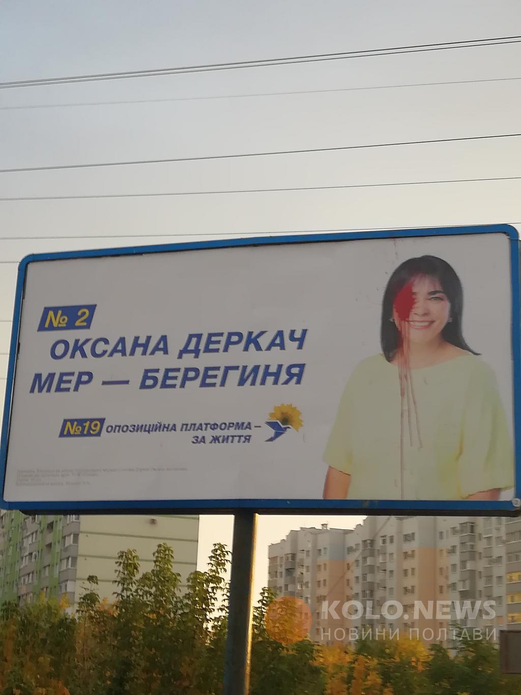 Посеред тижня червоною фарбою закидали і білборд із зображенням кандидатки на посаду Полтавського міського голови від «Опозиційної платформи – За життя» Оксани Деркач. Також фарбою пошкодили ще кілька білбордів з рекламою політичної сили. Крім того, спостерігачі ОПОРИ зафіксували у Полтаві сітілайт із зіпсованими агітаційними матеріалами ОПЗЖ .