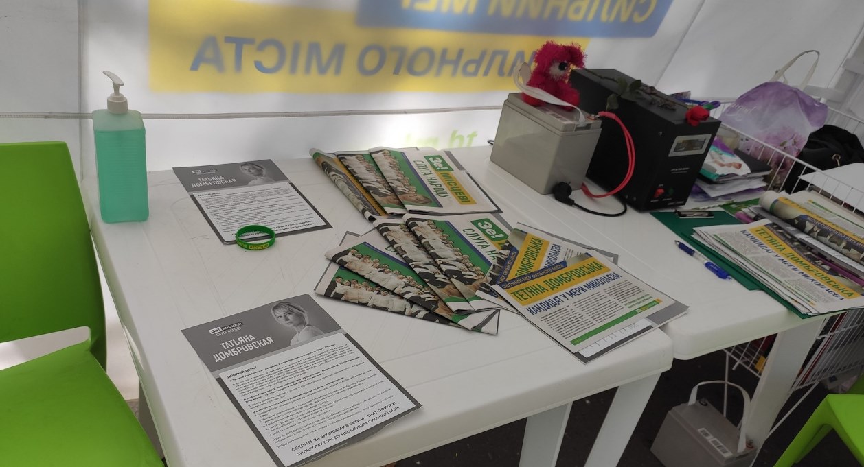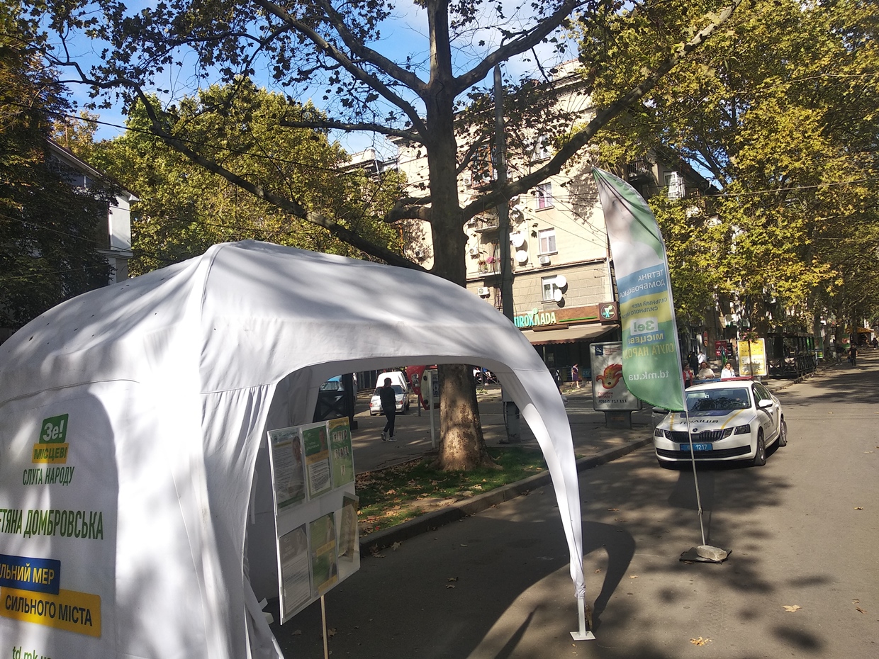 15 жовтня спостерігач Громадянської мережі ОПОРА зафіксував, як жінка біля намету з символікою політичної партії «Слуга народу» та написом «Тетяна Домбровська сильний мер сильного міста» роздавала інформаційні листки про партію та чорно-білі аркуші формату А4 без вихідних даних, але з фотографією кандидатки на посаду Миколаївського міського голови Тетяни Домбровської.