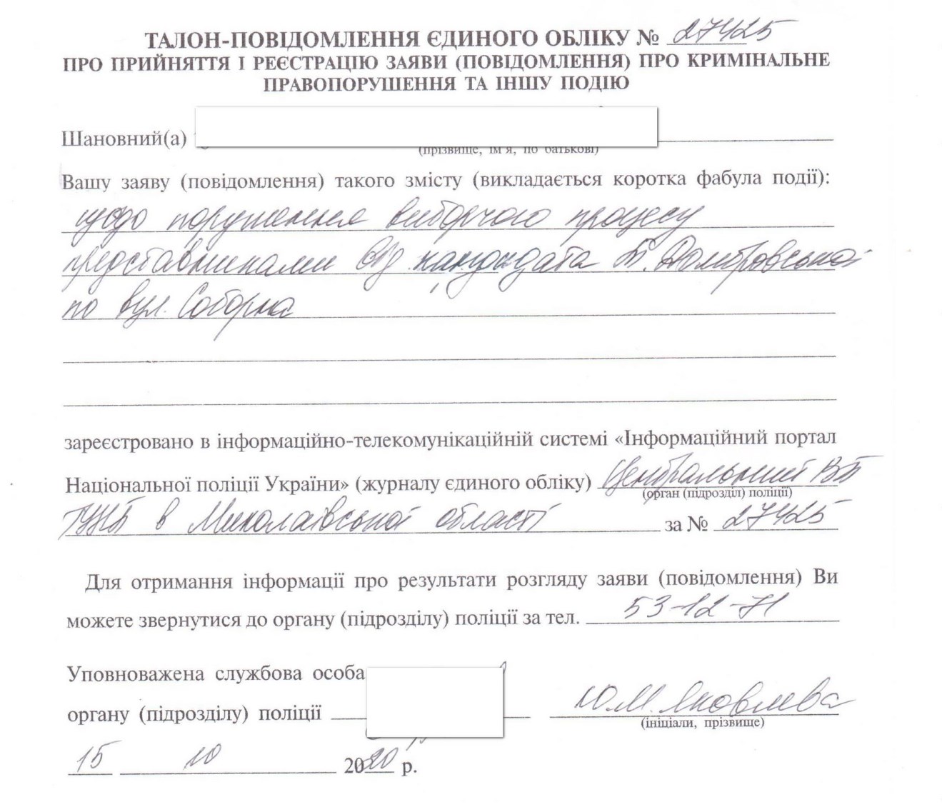 Зі слів спостерігача, особа, яка не представилась, запропонувала йому підробіток, а саме 250 гривень за розповсюдження агітаційних матеріалів і збір номерів телефонів, нібито для подальшого інформування про зустрічі з кандидаткою Тетяною Домбровською. Також жінка запропонувала спостерігачу прийти 25 жовтня, в день виборів, на свою виборчу дільниці, проголосувати «за будь-якого кандидата» та отримати за це ще 250 гривень. Після того, як жінка дізналась, що вона розмовляє з офіційним спостерігачем ОПОРИ, почала комусь телефонувати, згодом до неї підійшли два чоловіки, а сама вона зникла у невідомому напрямку. Спостерігач викликав на місце події правоохоронців та звернувся з відповідною заявою до Центрального відділу поліції ГУНП у Миколаївській області. Проте жінка щезла ще до приїзду представників правоохоронних органів.